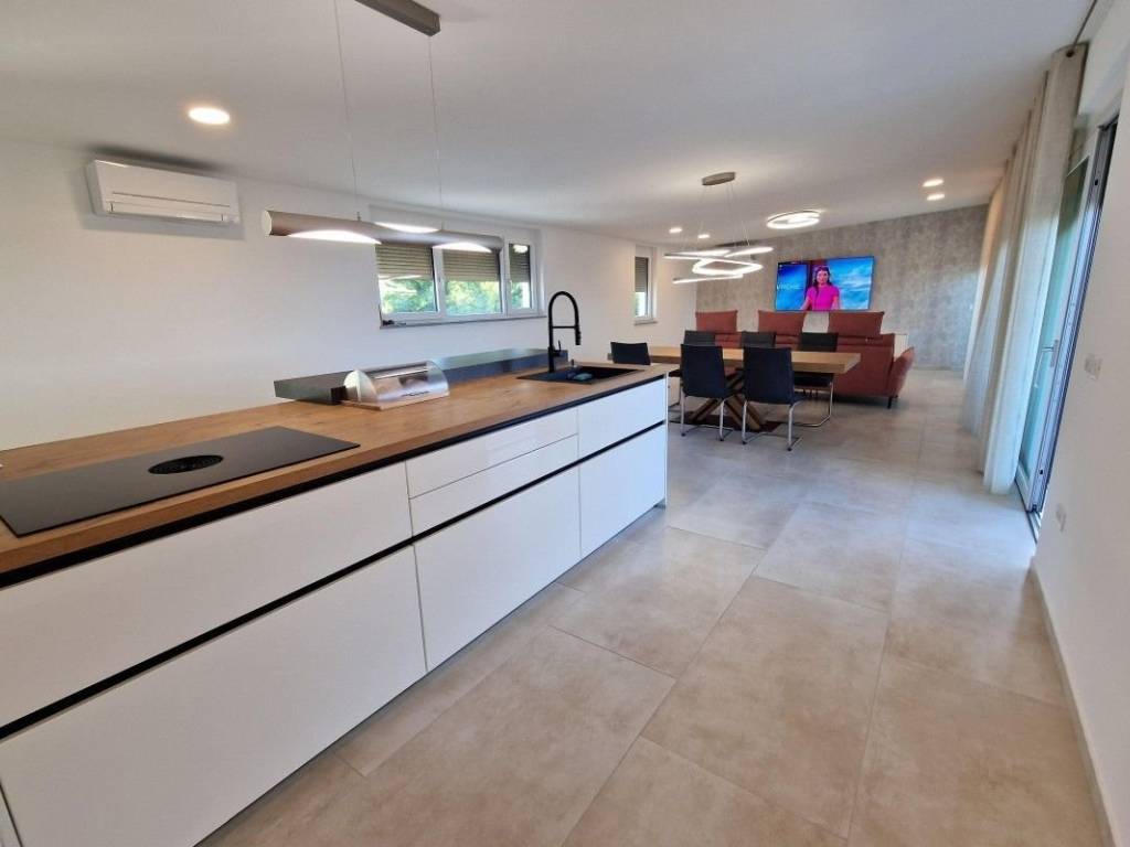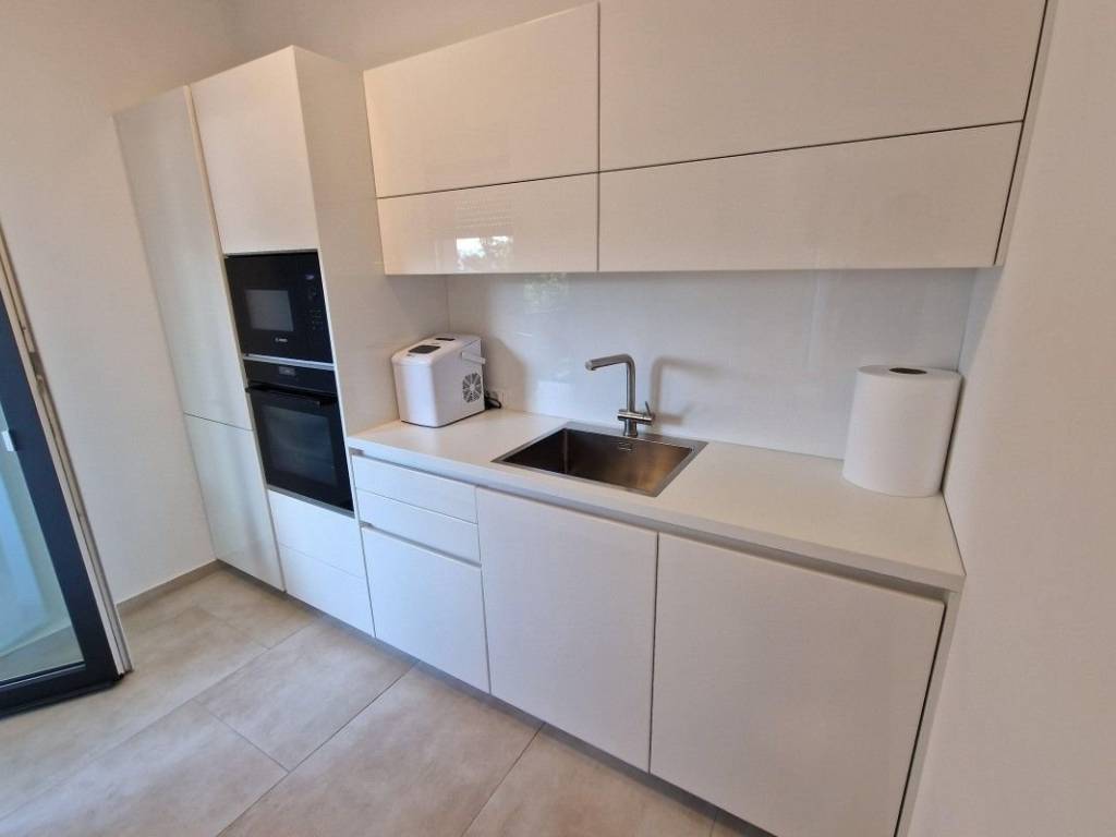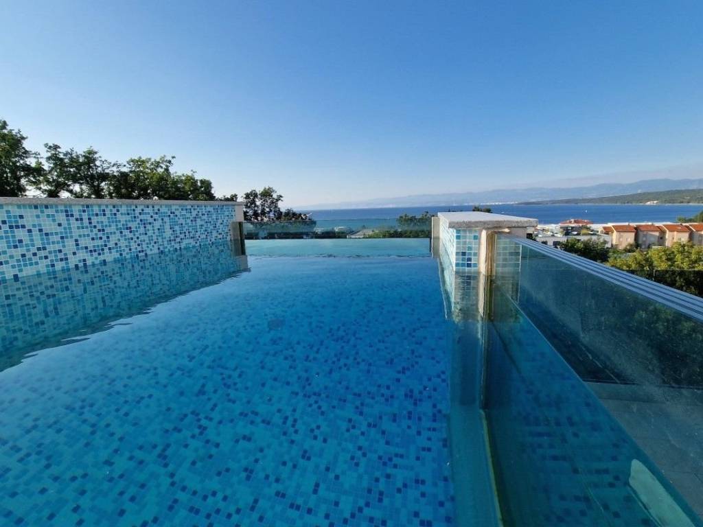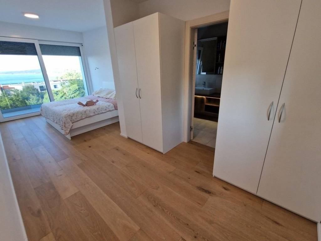 In a quiet location in Malinska there is a penthouse with sea view. It consists of three bedrooms, three bathrooms, a guest toilet and an open living area with a kitchen and dining room. The living room opens onto a 48 m² terrace with a swimming pool. All three bedrooms have access to a 15 m² balcony. The apartment is equipped with multisplit air conditioning for heating and cooling and PVC-aluminum windows with mosquito nets. The price includes three parking spaces and a 74 m² garden. Distance from the sea is 300 m.