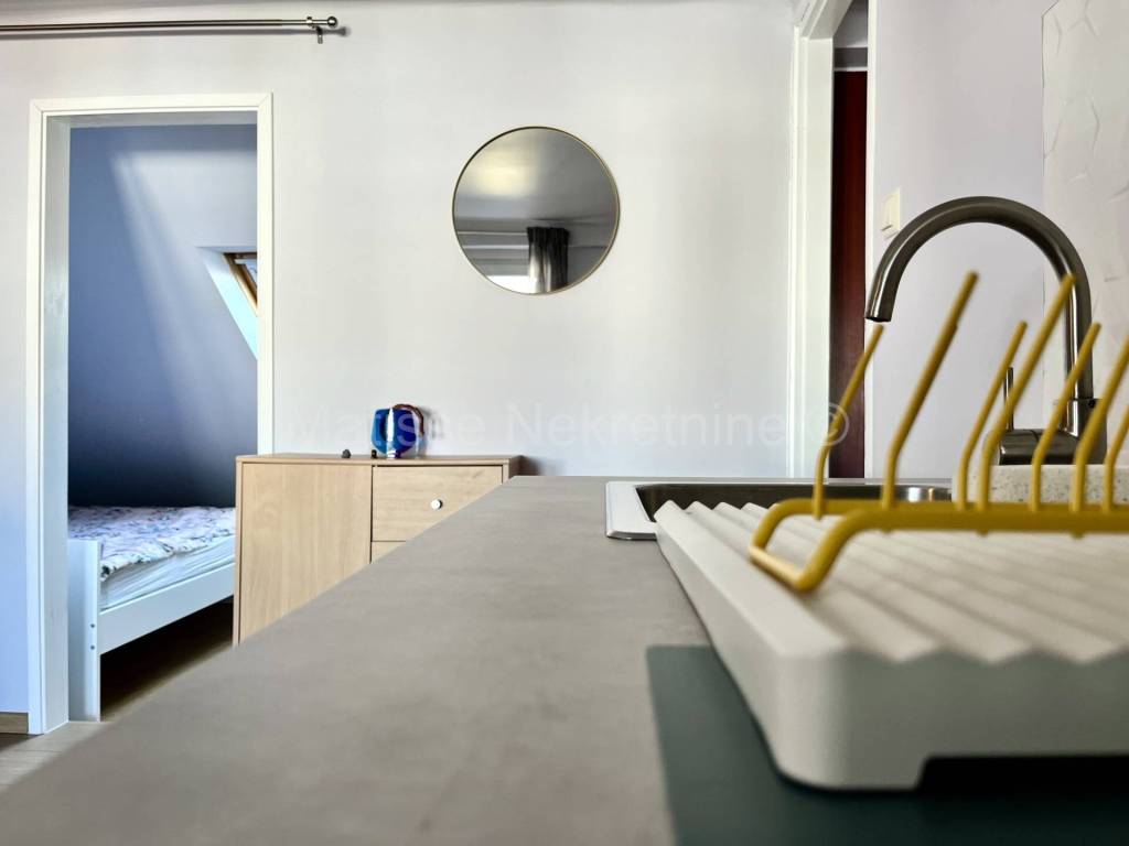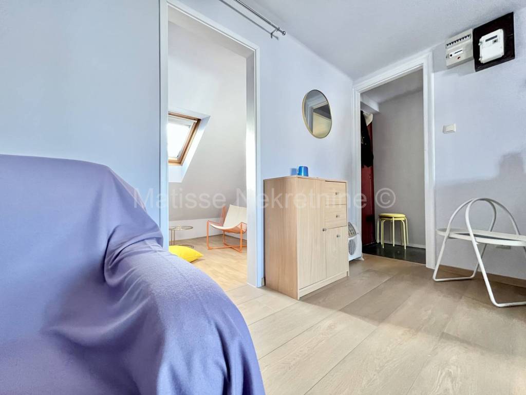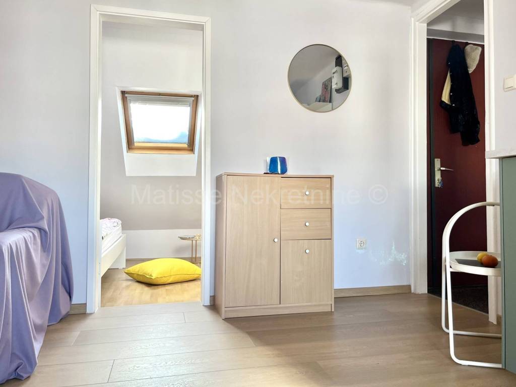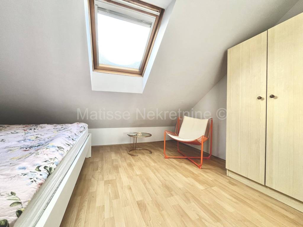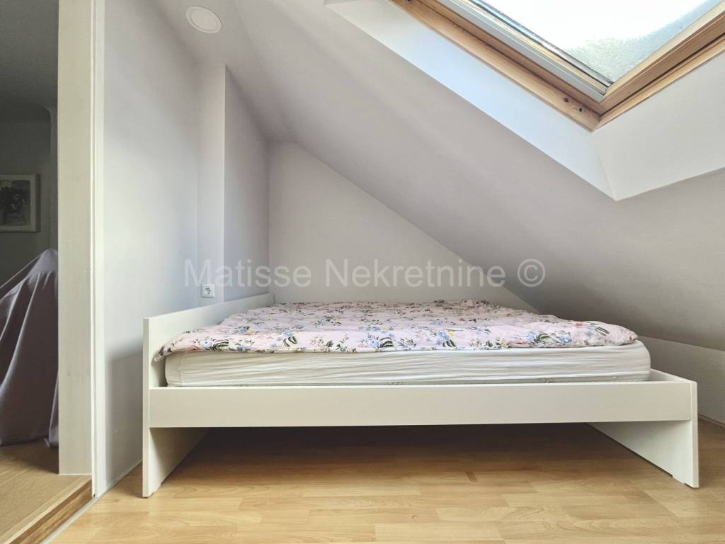 L'appartamento �� composto da corridoio, soggiorno con cucina, camera da letto, bagno, terrazza e due ripostigli. Il bagno �� spazioso e completamente nuovo, con vasca da bagno integrata e piastrelle di design. Anche la cucina �� nuova e ha un frigorifero integrato, con la possibilit�� di installare altri elettrodomestici secondo le necessit��. La camera da letto �� l'unico spazio con soffitto inclinato e ha una finestra a tetto che lascia entrare molta luce. La terrazza �� di 8,5 metri quadrati e offre una vista fantastica sulla citt�� e sul monte Sljeme. Dalla terrazza si accede a due ripostigli separati. Uno �� adibito a lavanderia, l'altro a deposito.