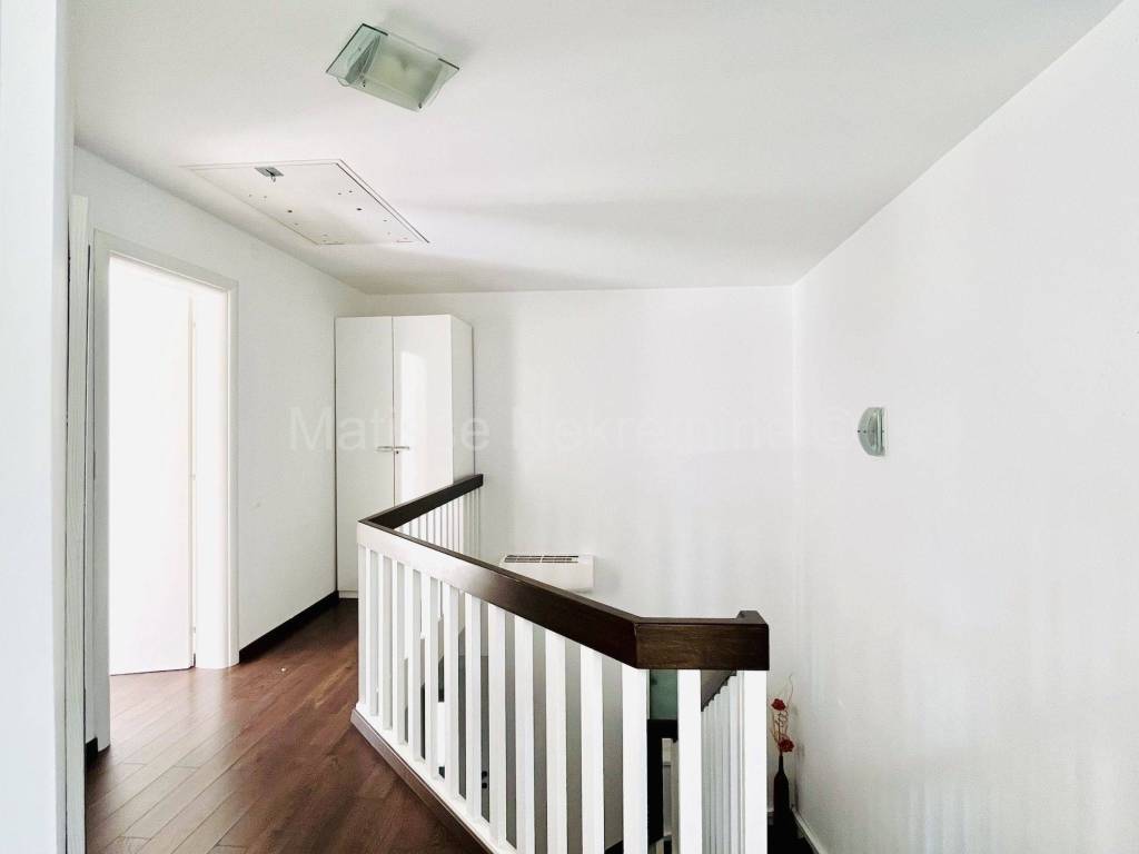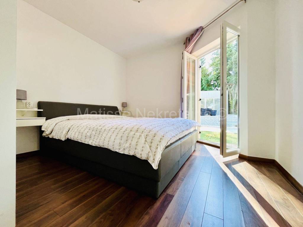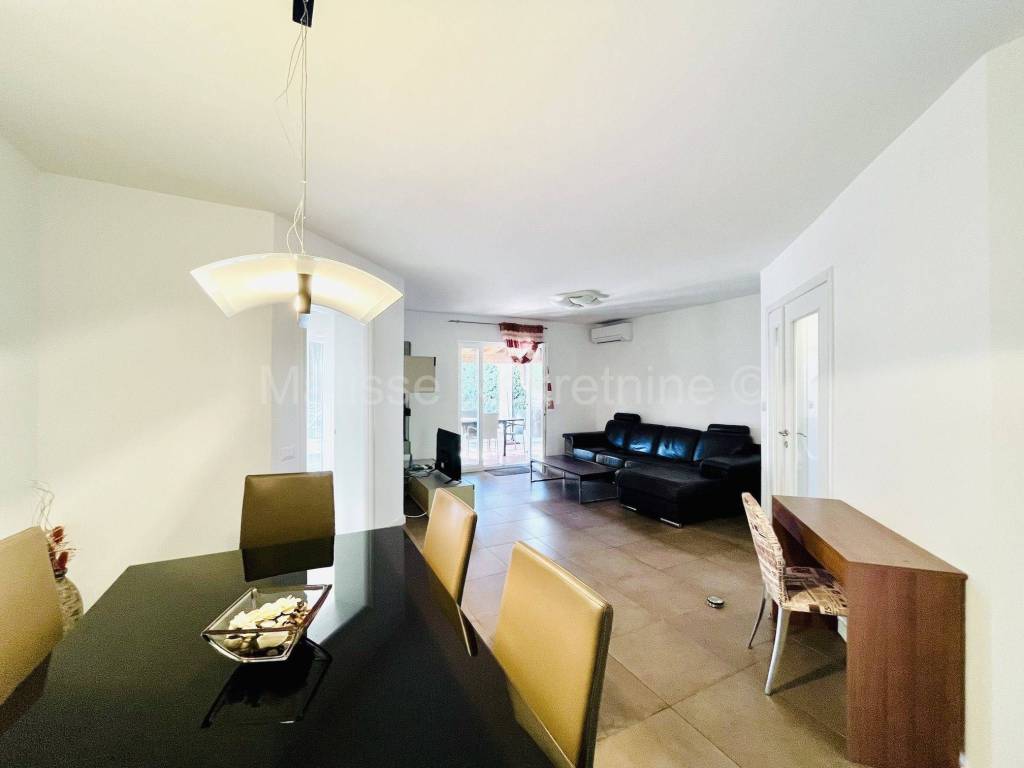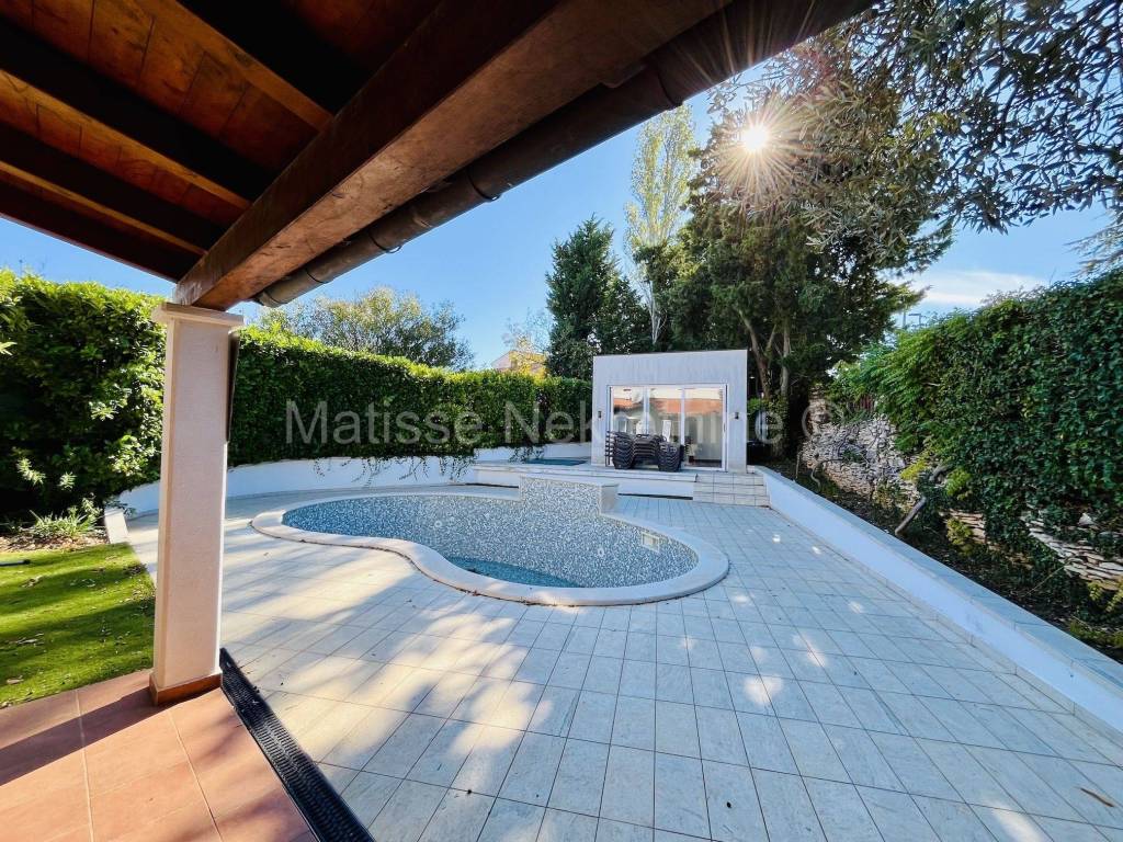 La casa �� composta da un piano terra e un primo piano, dispone di un garage e un posto auto, una spaziosa cantina, una terrazza con grill, e un cortile e piscina dove si trova un'altra dependance. Al piano terra si trovano un ampio ingresso con scala, un bagno, un soggiorno, una sala da pranzo, una cucina con uscita sulla terrazza e una camera da letto. Tutte le stanze hanno accesso al cortile, e il garage e la cantina sono collegati al resto della casa tramite la cucina. Il primo piano dispone di tre camere da letto e un bagno.