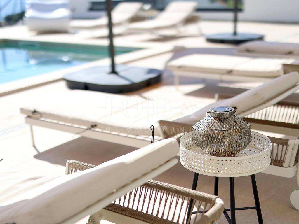 The villa is divided into a ground floor and an upper floor and consists of 5 modernly decorated bedrooms, each with its own bathroom, a large living area with a modern kitchen and dining room, and a spacious living room with large glass walls. In addition to the modern interior, the house is adorned with a landscaped garden with an infinity heated pool, a sundeck, a lounge area, and a barbecue.