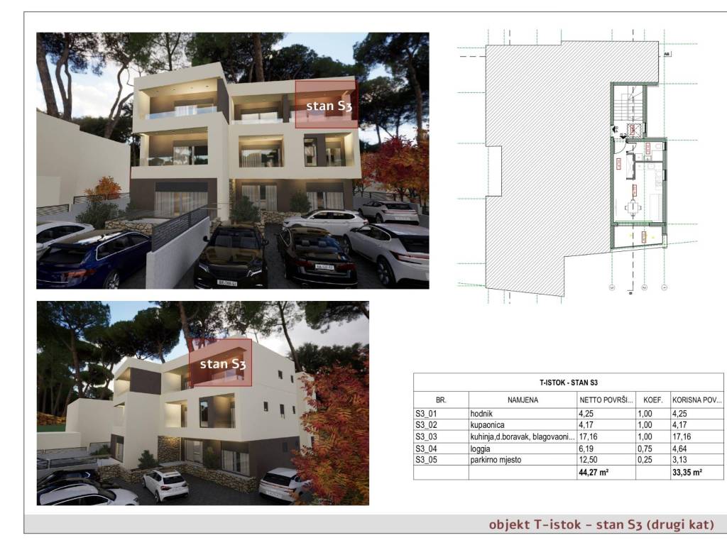 U Brodarici se prodaje novi stan oznake S3, smješten na drugom katu zgrade, ukupne površine 33 m². Stan je osmišljen kao kompaktan, ali funkcionalan prostor, idealan za samca, par ili kao praktična nekretnina za boravak na moru i dugoročno ulaganje.
