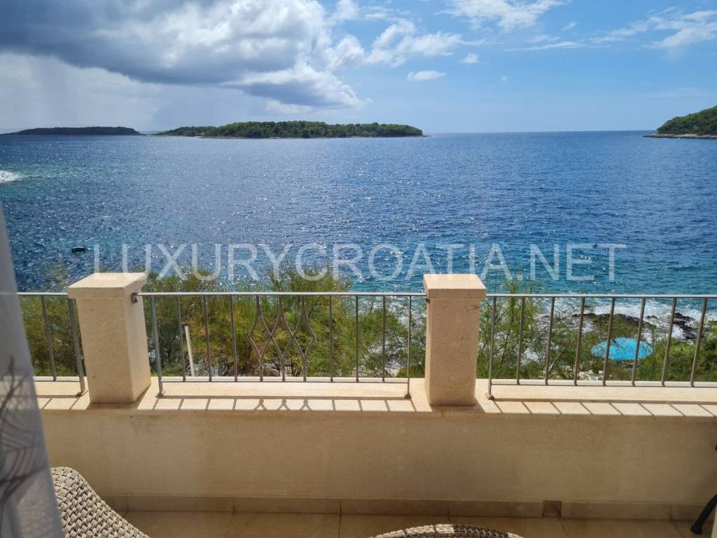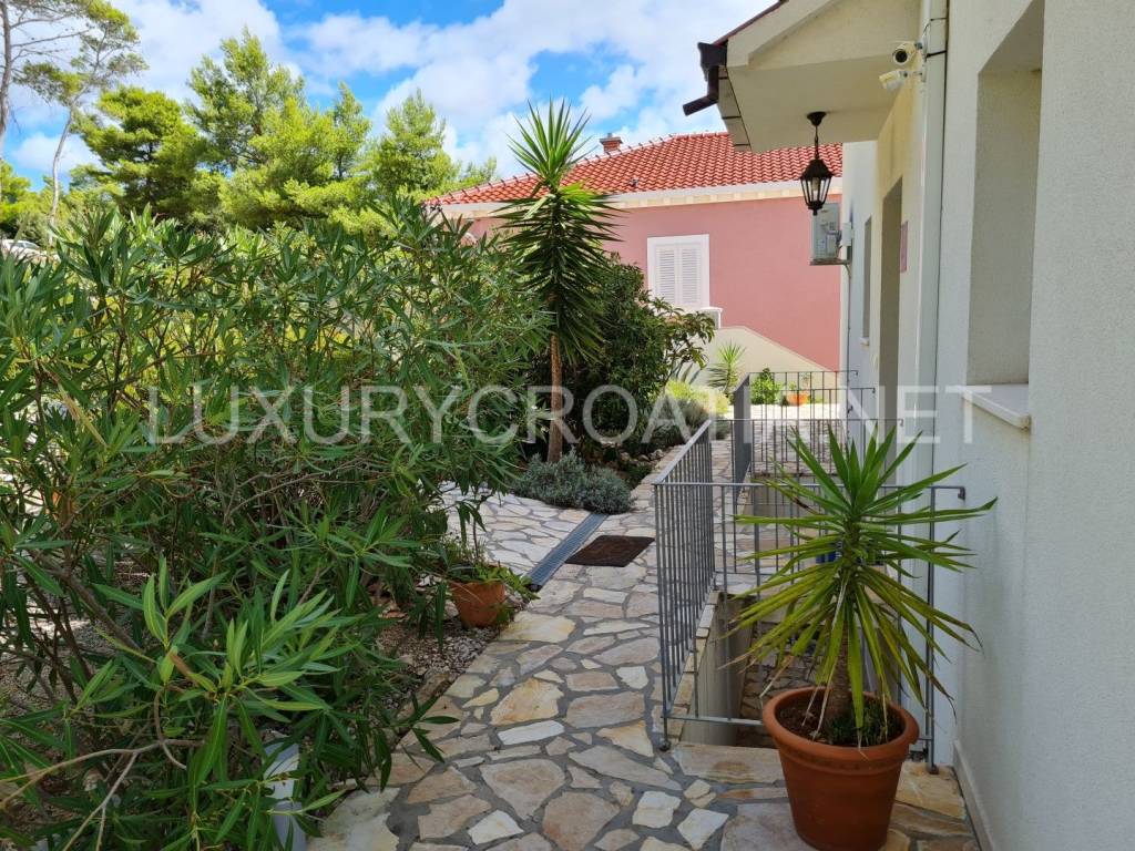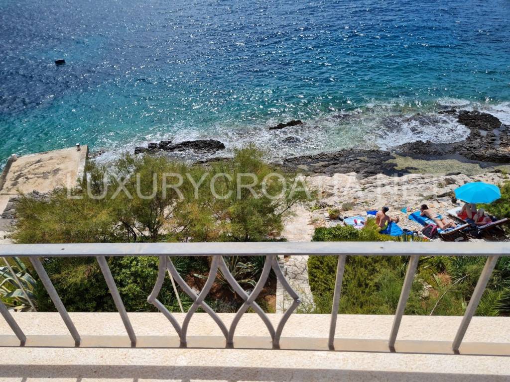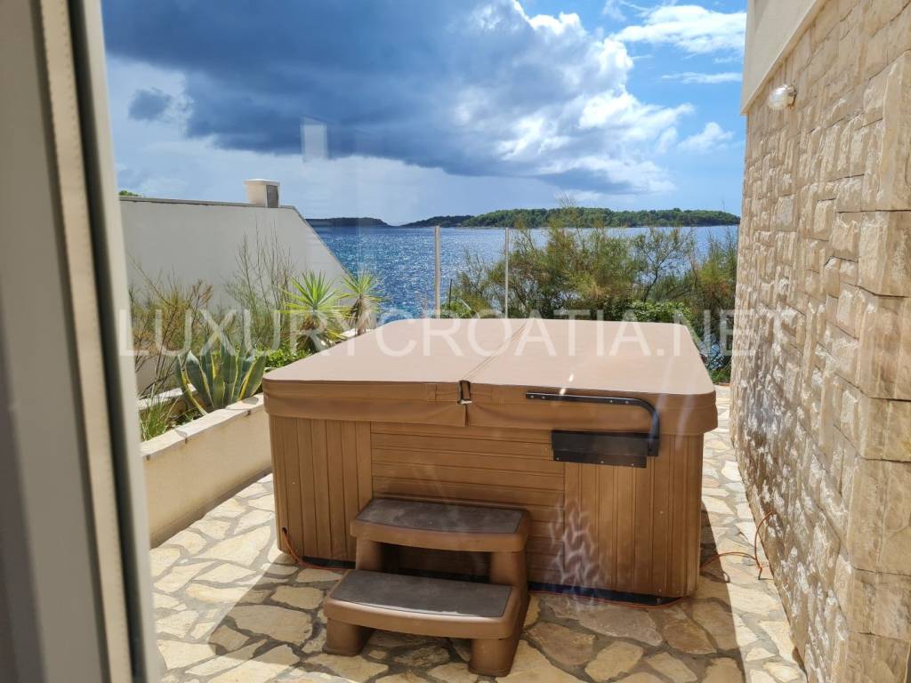The beachfront Villa with Jacuzzi is located right next to the beach, offering a spectacular sea view. This comfortable, Dalmatian, beachfront villa with jacuzzi is a perfect combination of elegance and comfort. It offers 4 bedrooms, 3 bathrooms, kitchen, living, and dining area. There is direct access to the sea through the garden of villa.