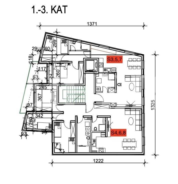 S8 - Dnevni boravak, kuhinja i blagavaonica, dvije kupaonice, tri spavaće sobe ukupne površine 84 m2 + balkon 5 m2 + 2 garažno PM = 1.600 eura/mjesečno