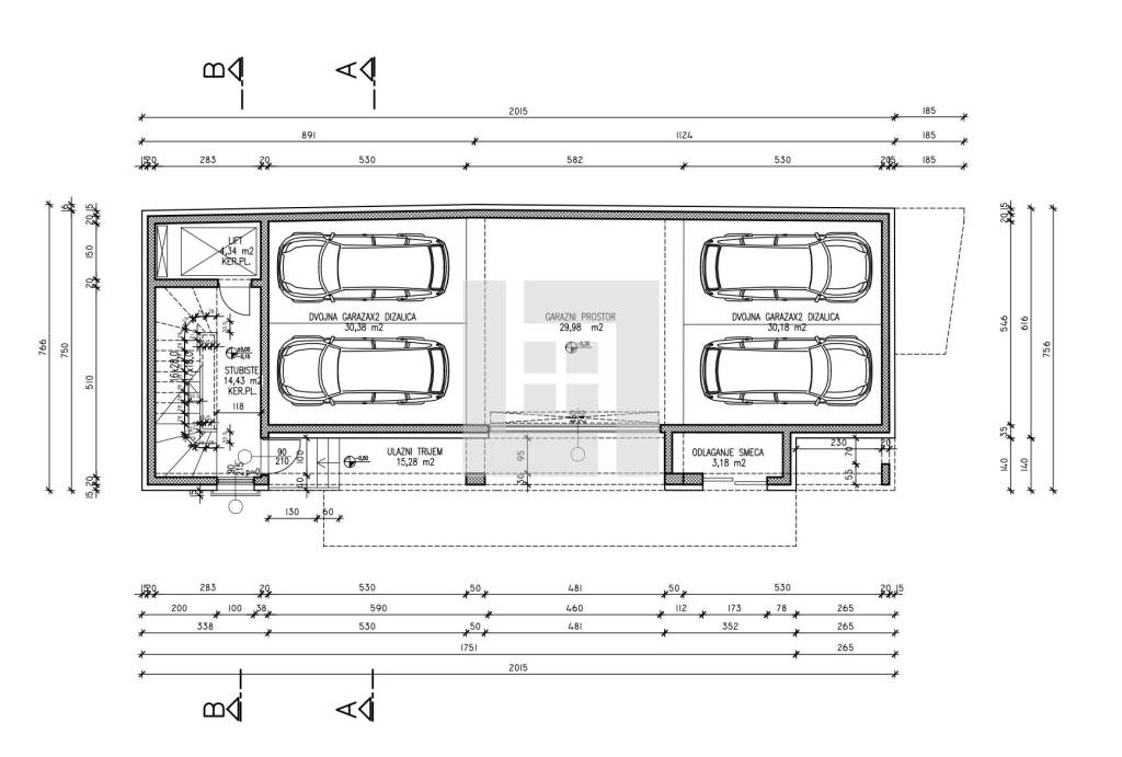 Two garage parking spaces (hydraulic scissors) must be purchased with the apartment. Approximately 15m2 each.