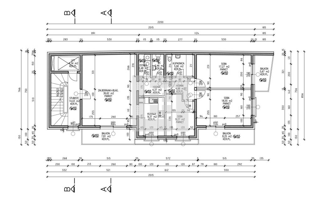 The apartment consists of a living room with dining room (36.62m2), separate kitchen (9.37m2), 3 bedrooms (9.27m2, 17.27m2 and 18.55m2), bathroom (5.90m2), guest toilet (2.46m2), storage room (2.48m2), 2 hallways (4.37m2 and 4.55m2) and 3 covered balconies (8.25m2, 7.81m2 and 5.67m2).