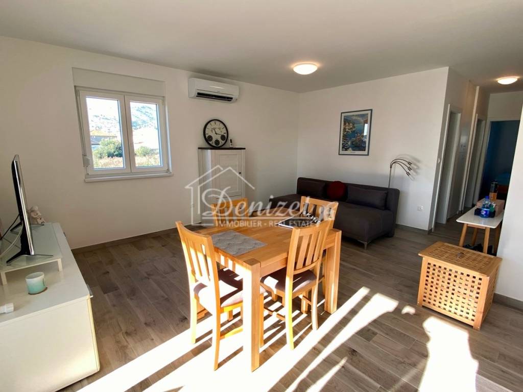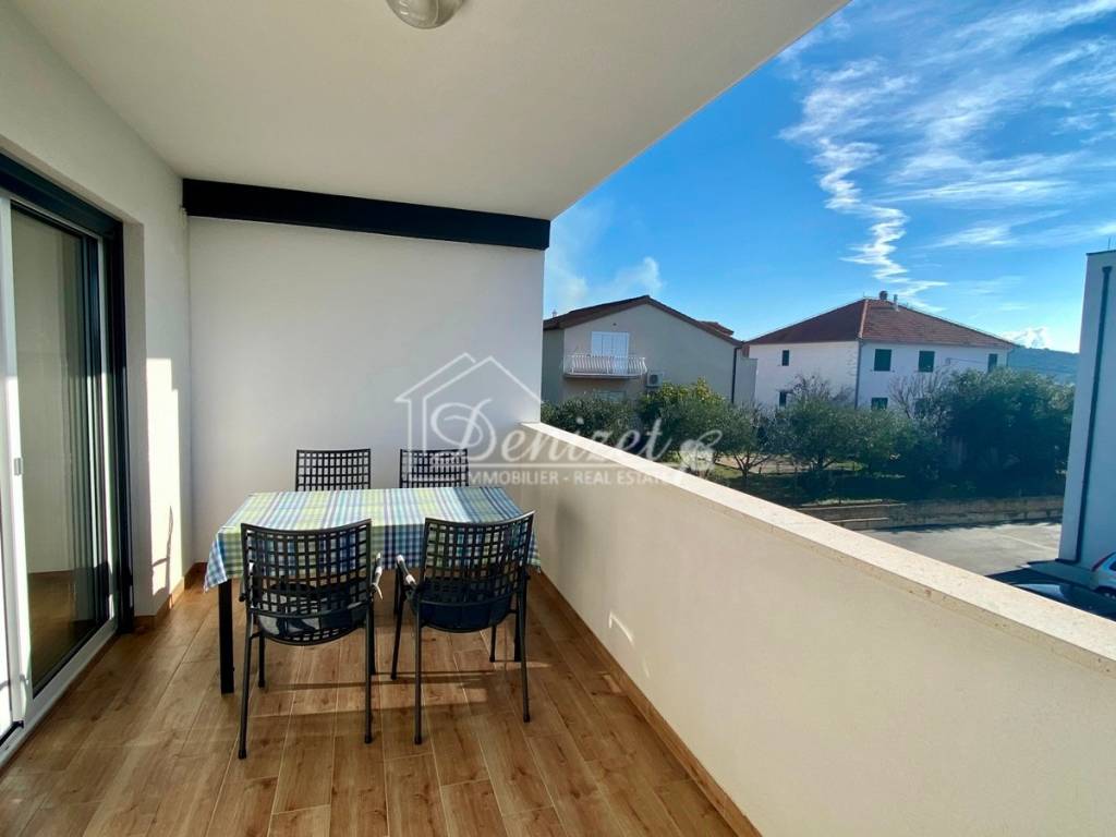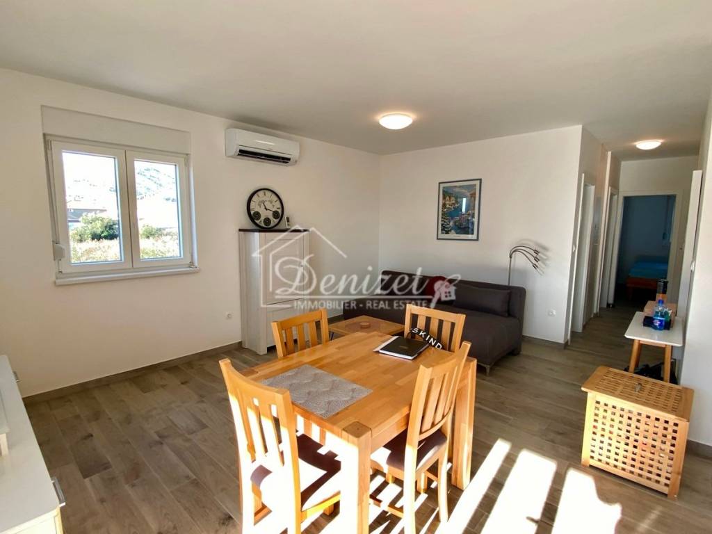 The apartment is located on the first floor of a building completed in 2023 with a total of six units. The living space is 50 m² plus a 12 m² south-facing balcony, promising plenty of sunshine. The apartment has two bedrooms, measuring 10 m² and 6.5 m², and a 5 m² bathroom. The 25 m² open-plan living and dining area is bright and airy. From here, you can access the balcony, which offers a lot of space for sunbathing and socializing. The apartment features underfloor heating, air conditioning, and satellite TV. It is being sold furnished with a fitted kitchen. As the property was only used as a second home, it shows no signs of wear and tear and is ready for immediate occupancy. The building is situated in a quiet part of Trogir. Amenities for daily needs are within walking distance. A parking space is also included in the price. Distances: Trogir Old Town: 1 km - Split Airport: 6 km - Trogir City Beach: 1.5 km - Supermarket: 800 m.