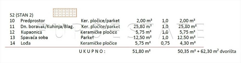 PRODAJE SE dvosoban stan sa privatnim vrtom oznake S2 u prizemlju stambene zgrade ukupne površine 114,10 m2 i neto korisne površine 56,58 m2.