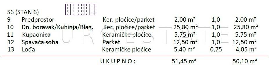 PRODAJE SE dvosoban stan oznake S6 na 1. katu stambene zgrade ukupne površine 51,45 m2 i neto korisne površine 50,10 m2.