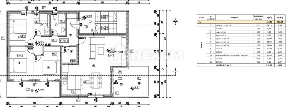 Apartment S2 is located on the first floor of the building and has a total net usable area of 112.53 m², of which 87.77 m² is interior space and 24.76 m² are terraces. The apartment consists of three bedrooms, two bathrooms, a hallway, a storage room, a living room with kitchen and dining area, and a spacious balcony and terrace. The apartment is oriented south-east-north.