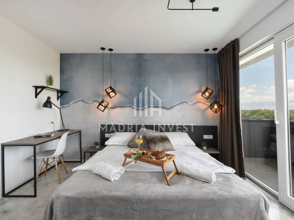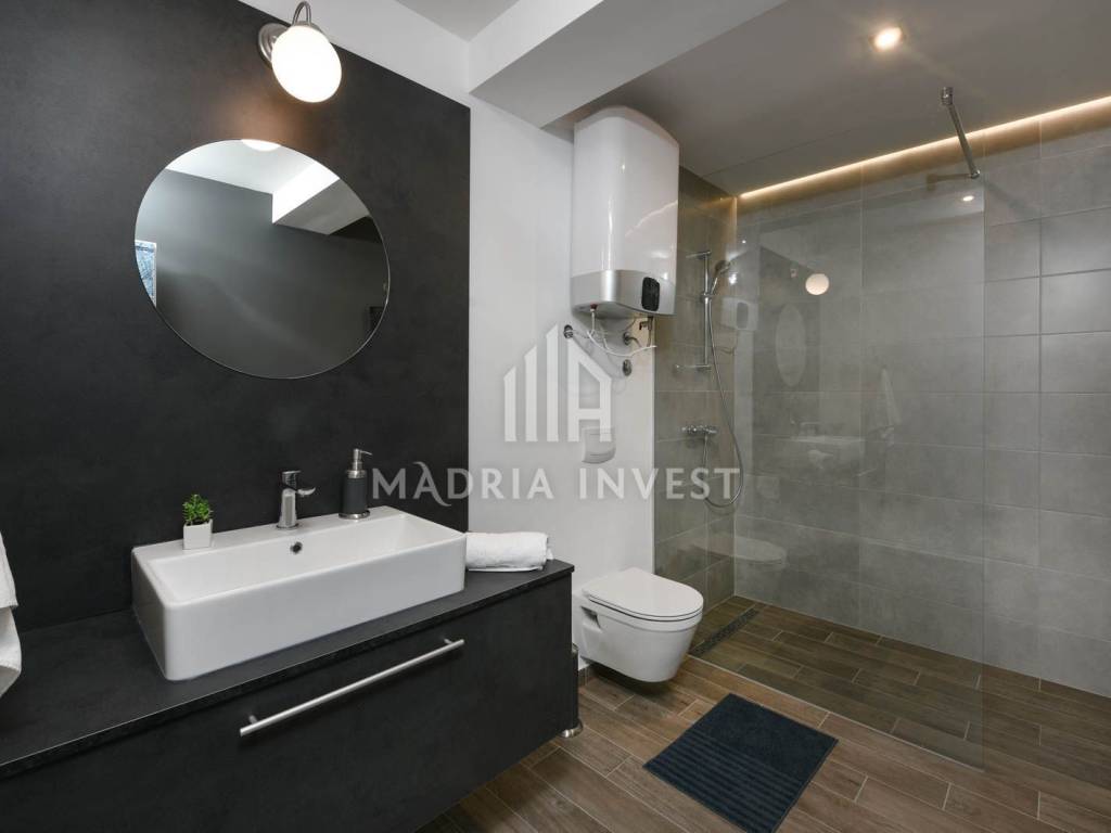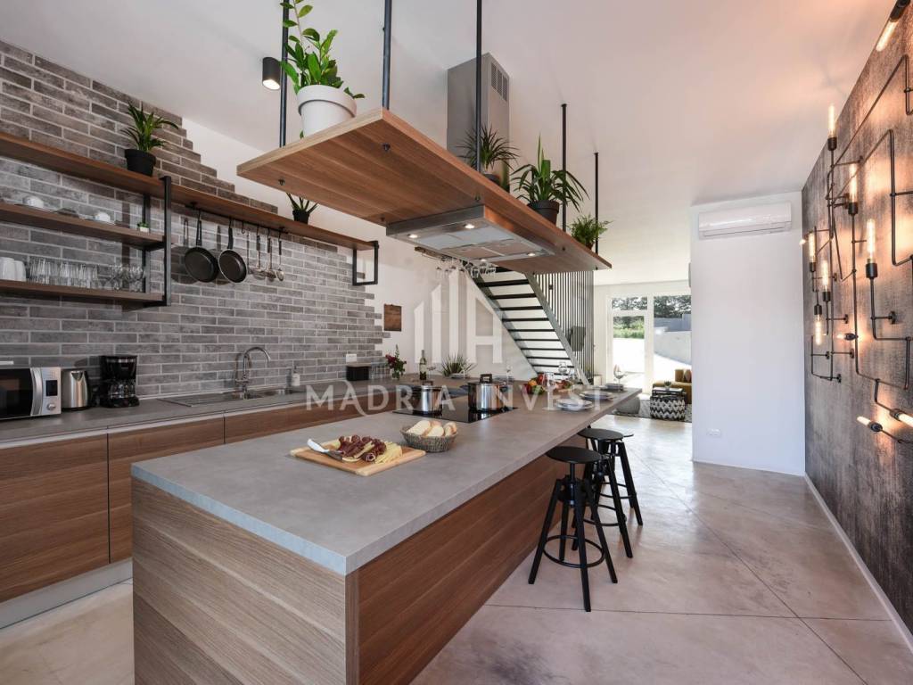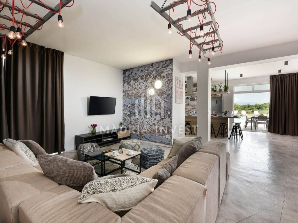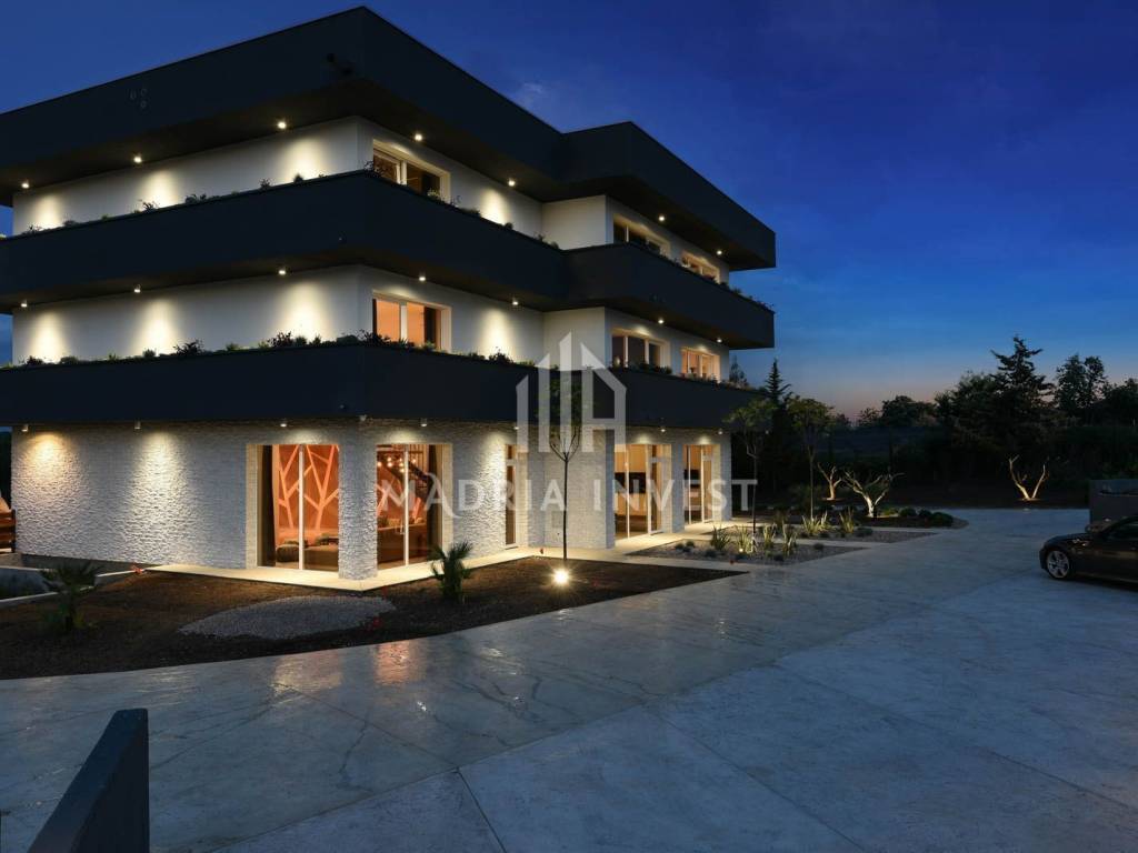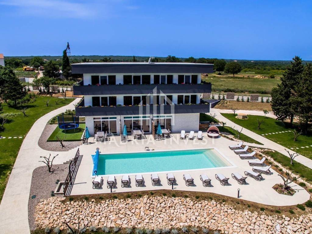Newly built exclusive villa of 600 m2 on the outskirts of Zadar. The villa consists of 3 exclusive apartments and is located on a landscaped plot of 2660 m2. In front of the villa there is a heated swimming pool of size 14*5 m, and an area for rest and entertainment (grill, swings, deckchairs...). The entire garden is illuminated and horticulturally arranged. All apartments are decorated according to the highest design standards. The kitchens are equipped with the most modern appliances. Each apartment has its own entrance and exit to the pool. The largest apartment extends to 190 m2 and has 5 bedrooms with the possibility of accommodating 10 people. Guests have at their disposal 4 comfortable bathrooms and one separate toilet. There are two more apartments in the villa, each measuring 150 m2. Each of them has 4 bedrooms, 4 bathrooms, a separate toilet and is comfortable accommodation for 8 people per apartment. The villa is perfect for all those who want to enjoy peace and quiet, away from city noise, and in touch with nature. This combination of modern architecture, top design, beautiful nature and accessible location makes the villa a perfectly functional unit for tourism in a mild Mediterranean climate. The property is sold fully furnished and ready for moving in or renting.