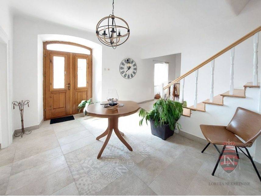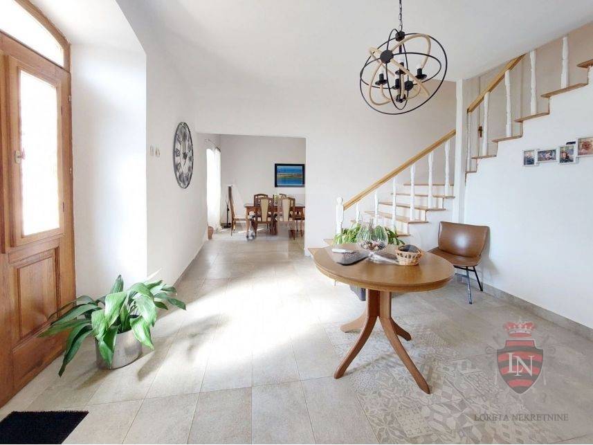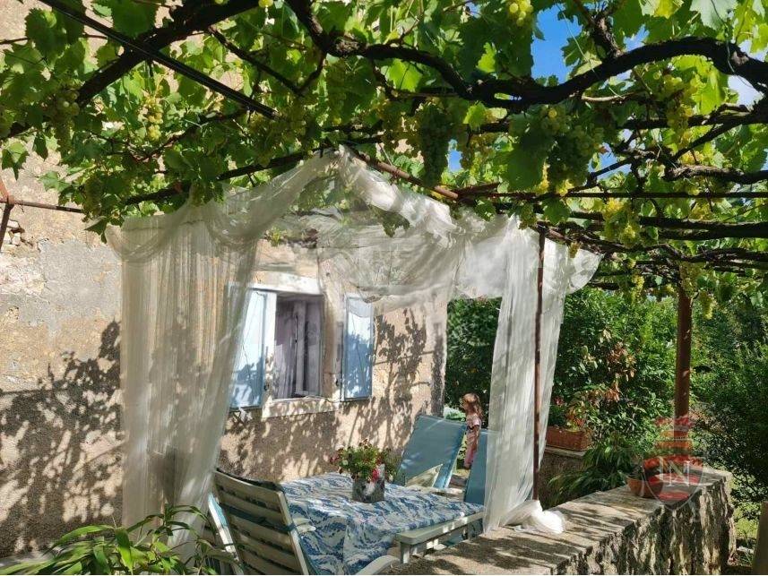 It has a garage, parking spaces, a small stone tavern, a rainwater collection tank, a garden, vines, and a large yard for leisure and enjoying privacy.