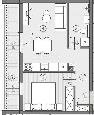 Ha una superficie totale di 45,39 m² e consiste in un corridoio d'ingresso con guardaroba, un bagno, una camera da letto, un soggiorno open space con cucina e zona pranzo con accesso a un balcone, e un posto auto.