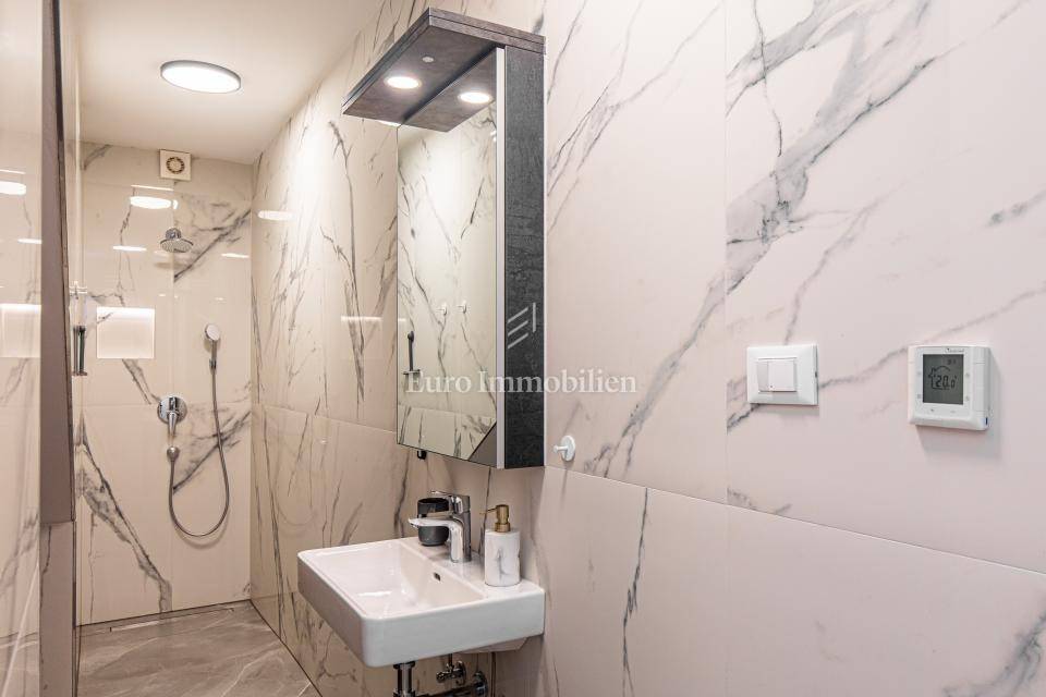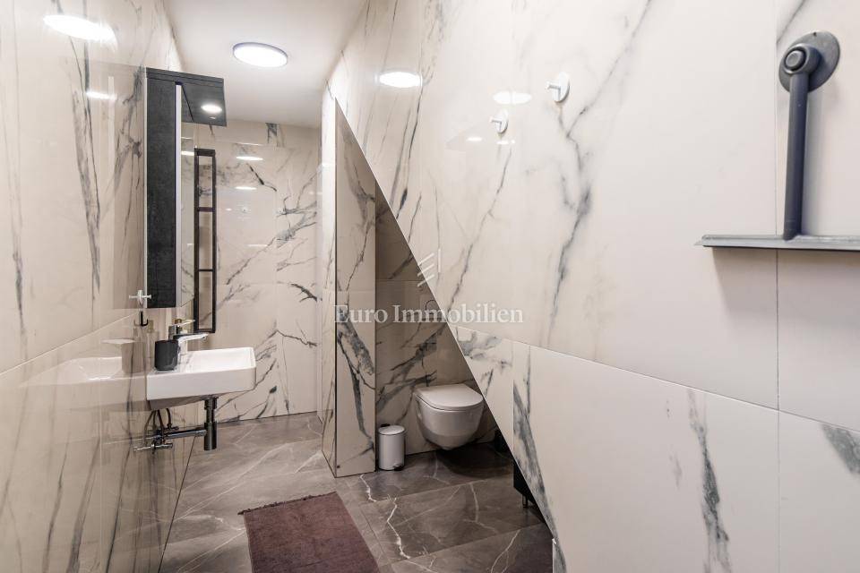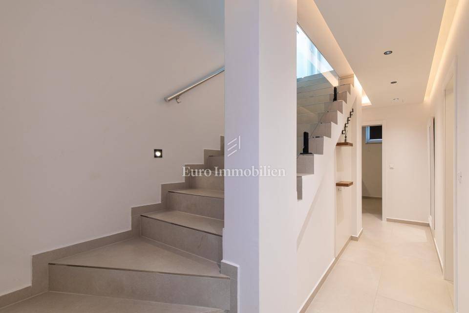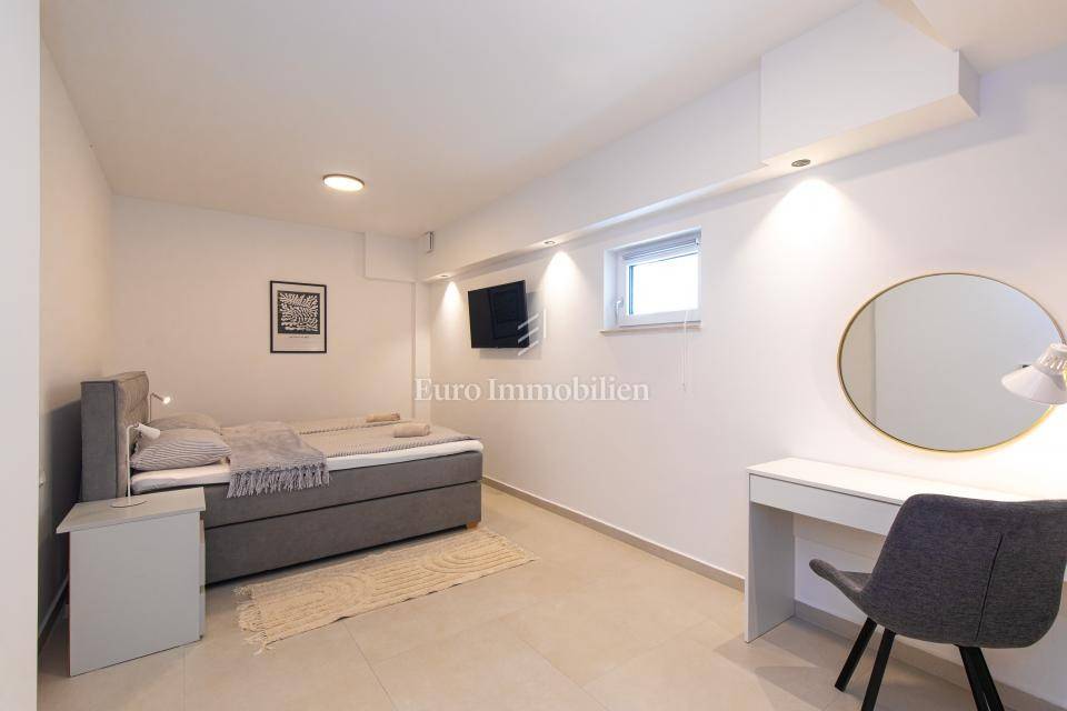 L'appartamento è composto da un seminterrato e un piano terra e ha una superficie di circa 100 m2. Nel seminterrato si trovano tre spaziose camere da letto, due bagni e una scala interna conduce al piano superiore. Al piano terra si trova uno spazio aperto che unisce la cucina con la zona pranzo e il soggiorno. Il terreno è completamente paesaggistico e dispone di una piscina privata. L'arredamento di questo appartamento garantisce il massimo comfort: tutte le stanze sono dotate di aria condizionata, riscaldamento a pavimento, infissi in PVC con tapparelle su tutte le finestre. L'appartamento viene venduto con mobilio e attrezzature realizzati su misura, compresi nel prezzo. Posizione tranquilla ideale per vacanza o affitto turistico. Ha due posti auto, documentazione adeguata!