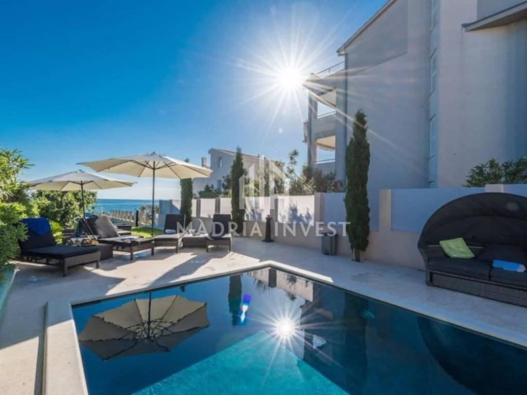 **Two-bedroom apartment with garden, 1st row to the sea** For sale is an apartment on the ground floor of a luxurious villa located right on the coast in Novalja on the island of Pag. The villa is located in an exceptional location - first row to the sea and the beach, with a spacious garden that leads directly to the sea. The apartment includes two bedrooms, two bathrooms and a living room connected to the kitchen and dining room in an open floor plan. The apartment comes with a private garden of 61 m², its own parking space and a storage room. It is being sold fully furnished and equipped, ready for moving in or tourist rental.