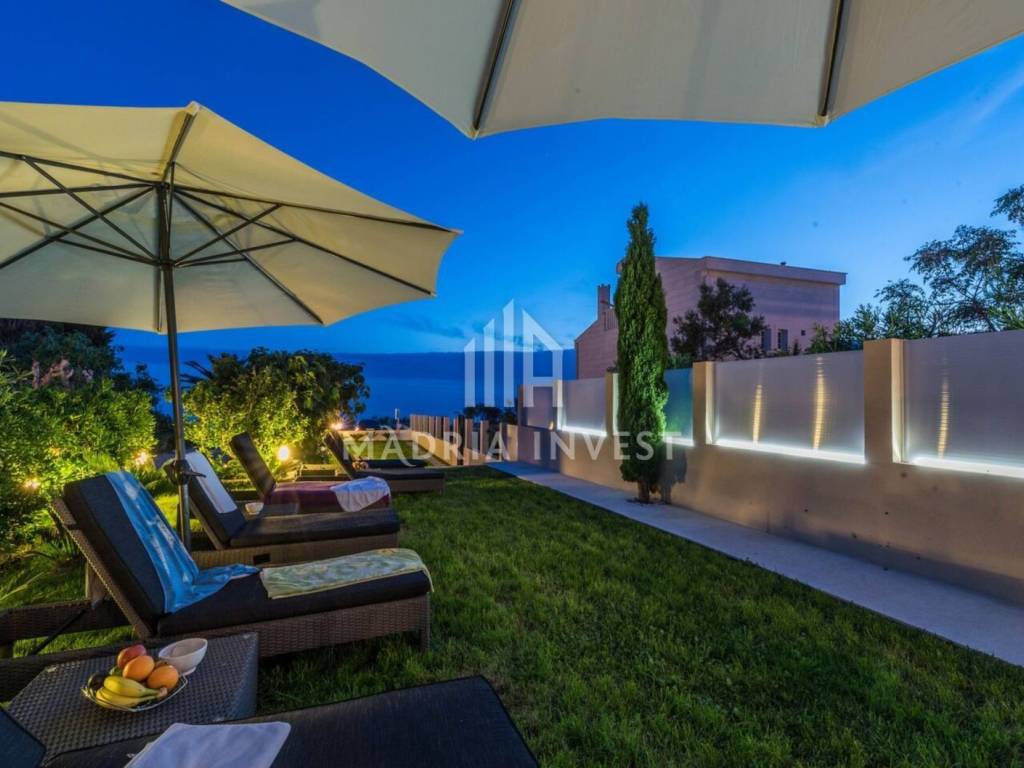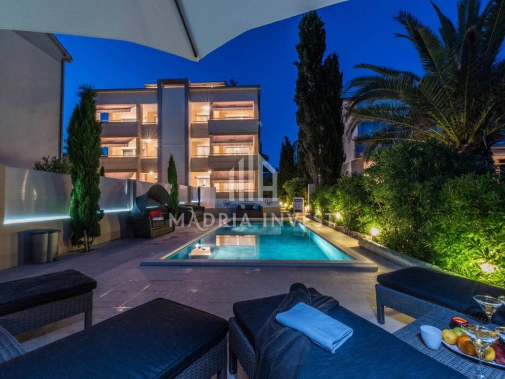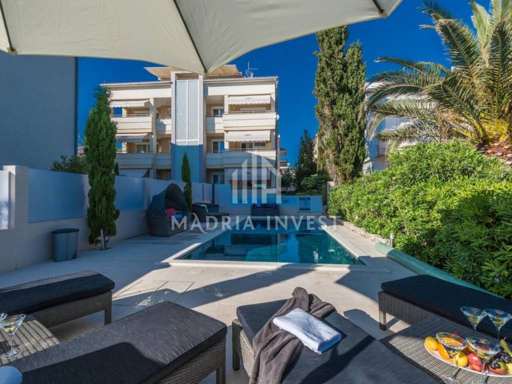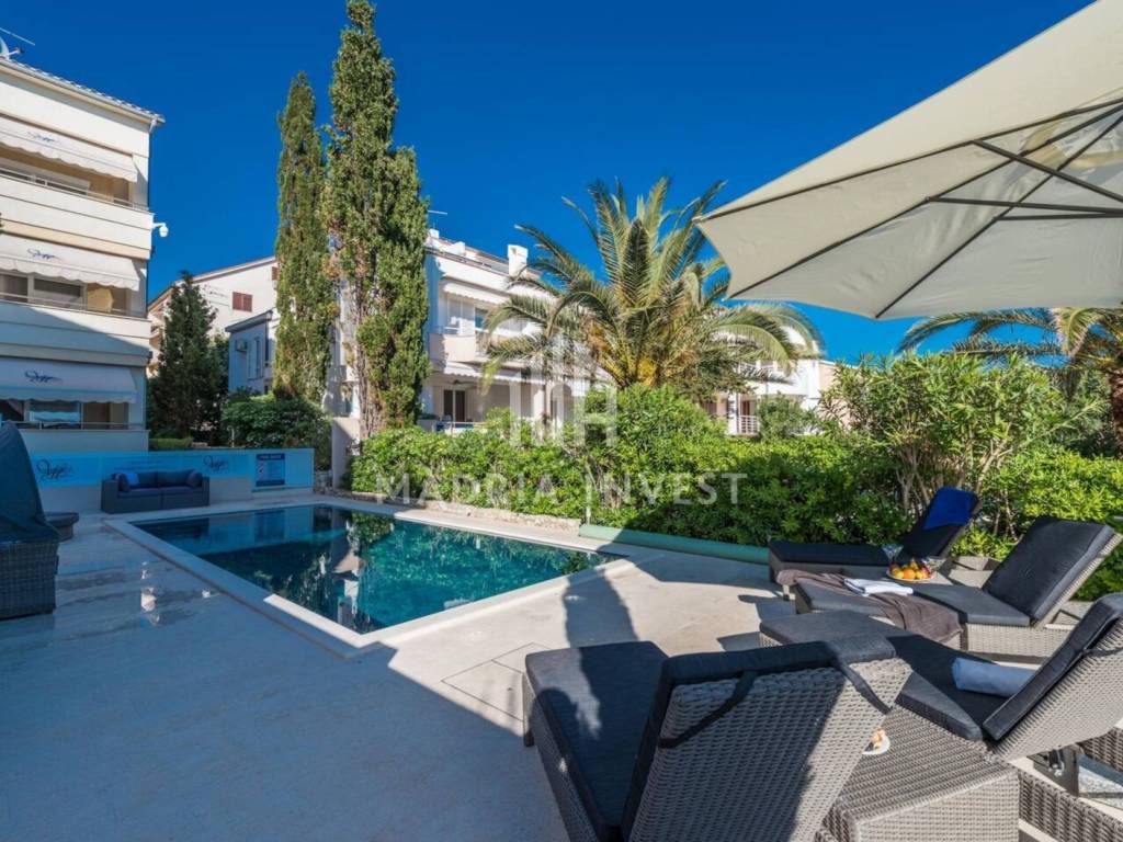 **Apartment 1st row to the sea, with swimming pool, Novalja** For sale is an apartment on the ground floor of a luxurious villa located right on the coast in Novalja on the island of Pag. The villa is located in an exceptional location - first row to the sea and the beach, with a spacious garden that leads directly to the sea. The apartment includes two bedrooms, two bathrooms and a living room connected to the kitchen and dining room in an open plan. The apartment comes with a private garden of 250 m², 2 parking spaces, a swimming pool and a storage room. It is being sold fully furnished and equipped, ready for moving in or tourist rental.