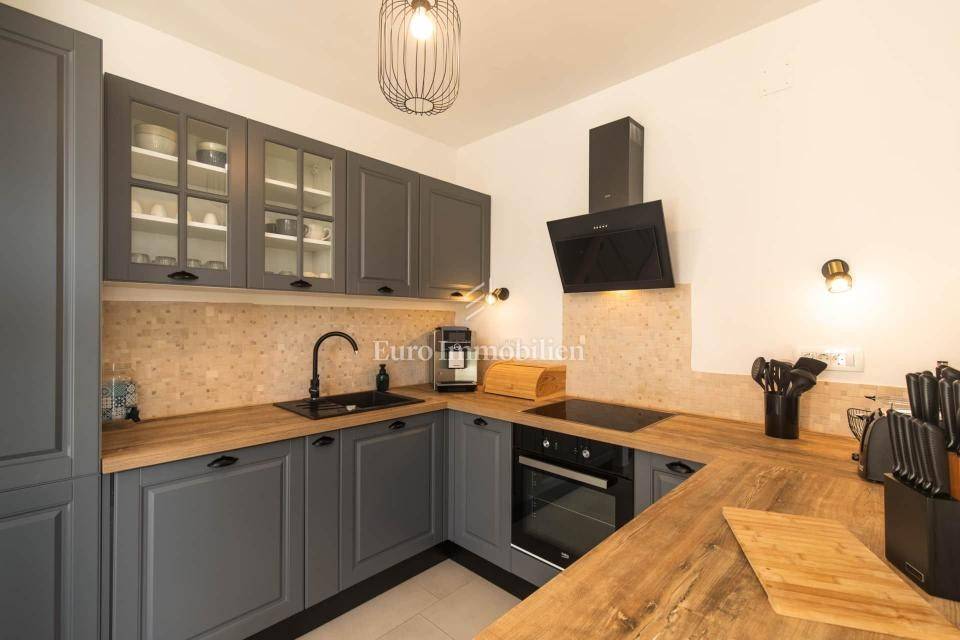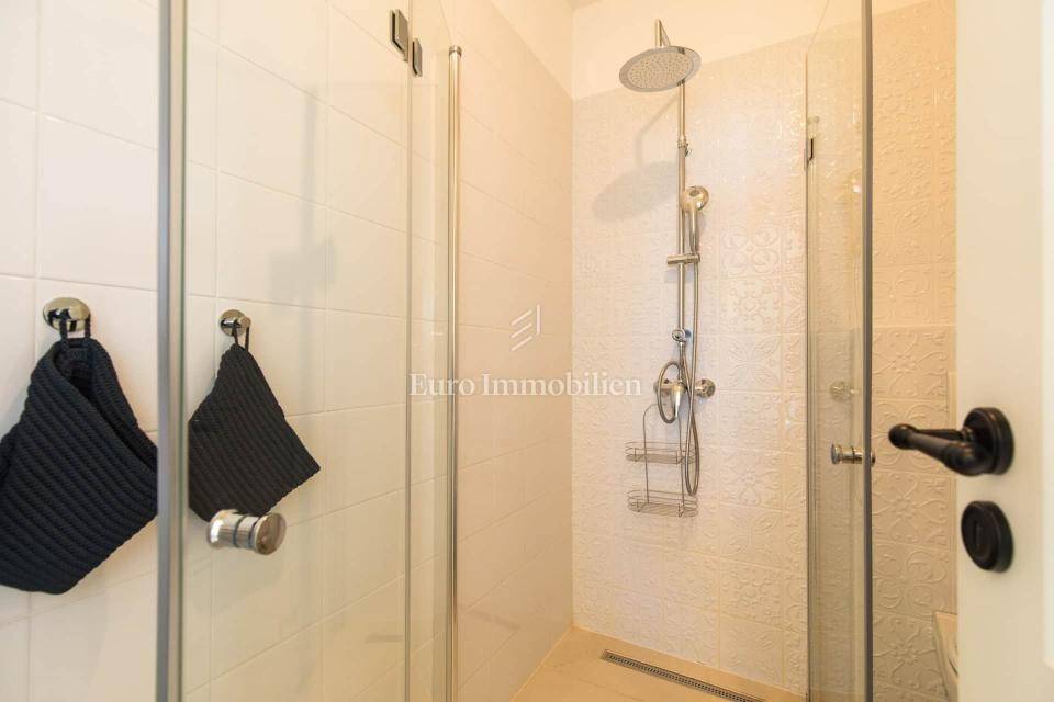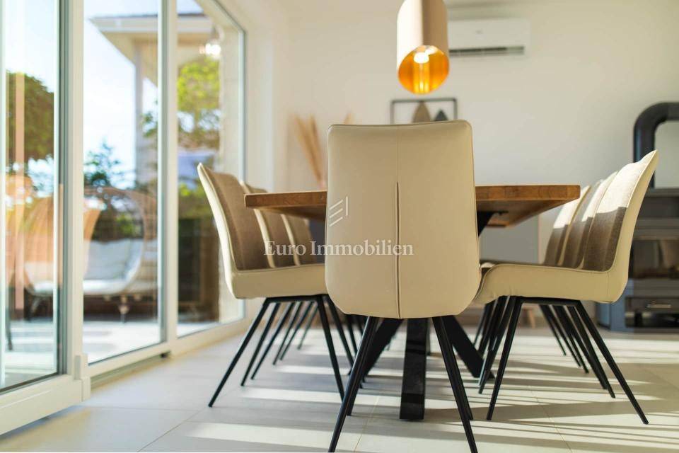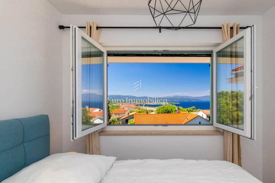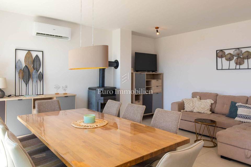 Isola di Krk, zona Malinska, vendesi casa bifamiliare di 115 m2 con giardino di circa 150 m2. La casa è composta da un piano terra e un piano superiore. Al piano terra si trova un soggiorno con cucina e zona pranzo, una camera da letto, un bagno e un ripostiglio. Al piano superiore ci sono tre camere da letto, una delle quali ha il proprio bagno, mentre le altre due condividono un bagno. Al primo piano c'è anche una terrazza con una bellissima vista sul mare.