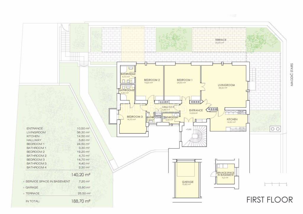 Terrace (25 m2). Garage for 1 car (not a requirement). Separate laundry room.