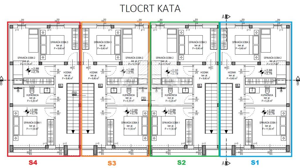 Residential unit S2 has its own covered entrance and extends over two floors with a total area of 108.04 m².