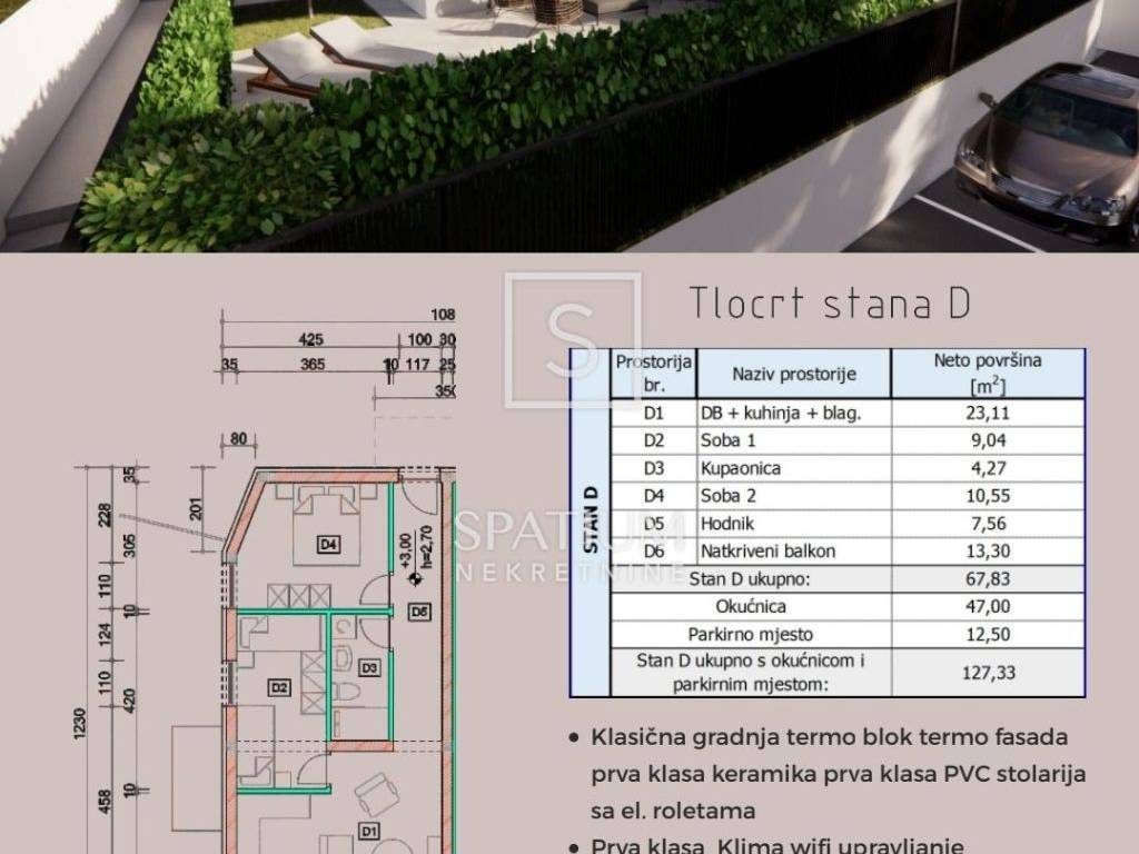ISOLA DI KRK, OMIŠALJ, offriamo un appartamento con piscina in un nuovo edificio situato in una posizione tranquilla vicino al mare e alla spiaggia. L'appartamento ha una superficie di 67,37 m2 e si trova al piano terra di un nuovo edificio residenziale ed è composto da due camere da letto, un bagno e servizi igienici, una cucina con sala da pranzo e soggiorno e accesso a una terrazza coperta con piscina. Dispone di un appezzamento di terreno con cortile e giardino di 55 m2 e di un posto auto di proprietà del proprietario di 12,50 m2. Facciata termica di prima classe, ceramiche di alta qualità, serramenti in PVC con tapparelle elettriche. Aria condizionata in ogni stanza (controllo Wi-Fi), riscaldamento a pavimento, cabina doccia, connessione Internet, impianto elettrico modulare. attrezzature, porte di sicurezza. La posizione di questa proprietà è eccezionale e molto richiesta: il mare e la spiaggia distano solo 120 metri, mentre il centro del paese è a soli 800 metri. OPPORTUNITÀ DI INVESTIMENTO! Immobili per vivere, trascorrere le vacanze o visitare il mondo. Omišalj è la cittadina più settentrionale dell'isola di Krk: si trova nei pressi del ponte, accanto a una baia abitata fin dalla preistoria. La città ha una tradizione turistica di oltre 100 anni e offre un'esperienza turistica completa. Oltre alla sua eccellente posizione geografica vicino al ponte, all'aeroporto e alla città di Fiume, offre anche un'eccellente e varia offerta gastronomica e la possibilità di una vacanza attiva con numerosi percorsi ciclabili ed escursionistici. Il clima mite mediterraneo, le bellissime spiagge e quasi 2.500 ore di sole sono la combinazione ideale per una vera vacanza. Inoltre, con la sua natura incantevole e tutto ciò che ha da offrire, il ricco patrimonio storico e una fonte inesauribile di ispirazione, Omišalj vi invita a conoscerla ancora meglio e a goderne i benefici. Per qualsiasi ulteriore informazione, non esitate a contattarci con fiducia. Mislav Smolčić assistente intermediario +385 91 500 6757 mislav@spatium.hr Vesna Smolčić agente autorizzato +385 91 571 7682 vesna@spatium.hr Spatium nekretnine +385 51 452 479 info@spatium.hr