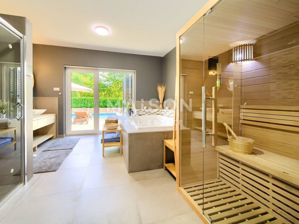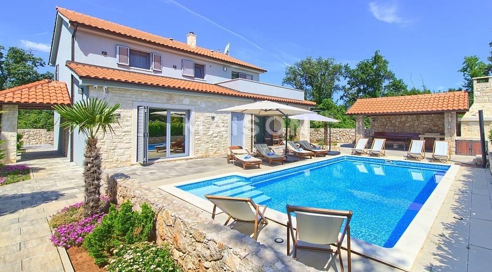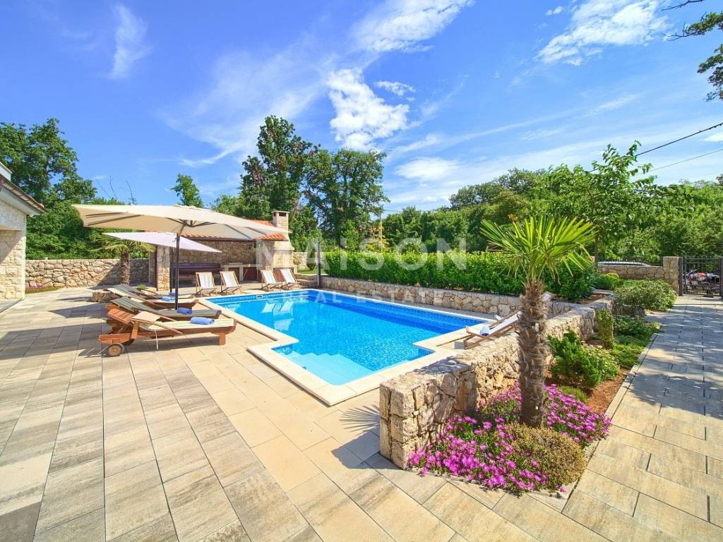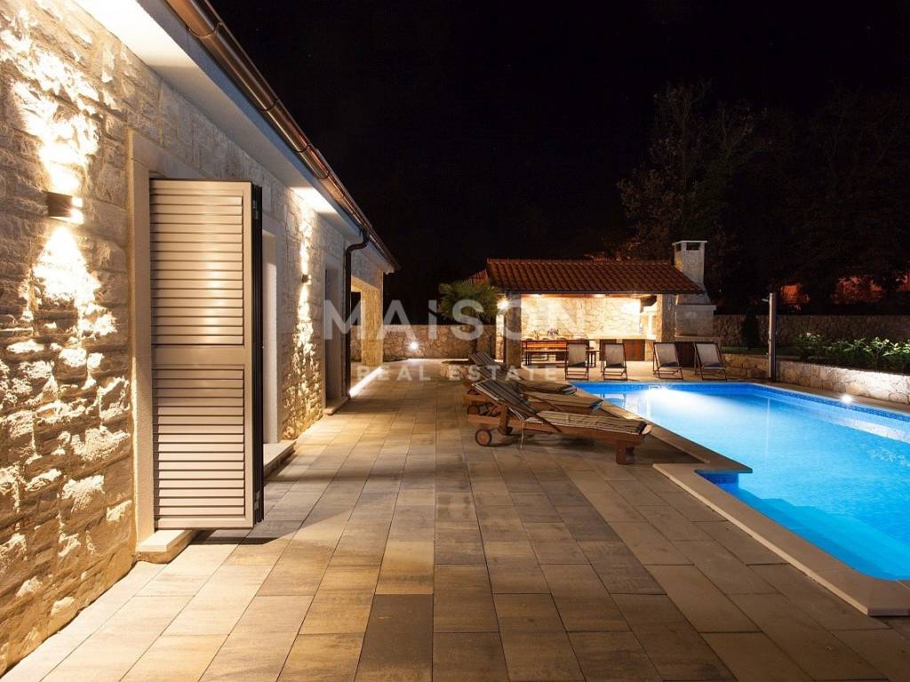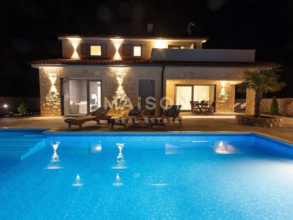 Nella tranquilla zona interna dell’isola di Krk, al margine della zona edificabile, si trova un’elegante villa di 185 m², che offre la perfetta combinazione di lusso, privacy e comfort.