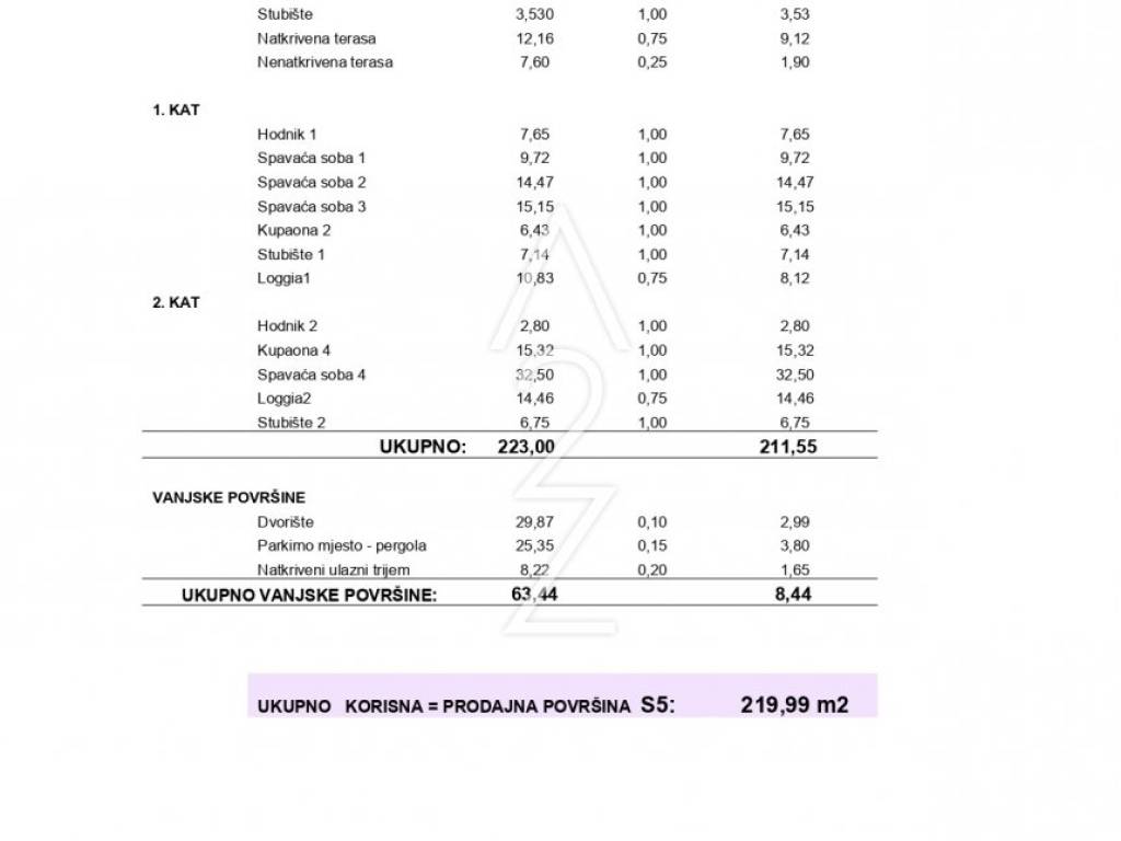 Residential unit S5 has a net living area of 219.99 m², consisting of a ground floor, first floor, and second floor, and includes a private yard and two covered parking spaces under a pergola. The apartment price ranges from €4,000 to €4,500 per m².
