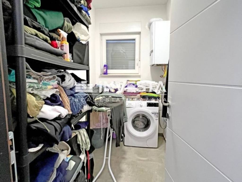 Una scala esterna conduce al piano superiore, dove si trova un appartamento moderno. L'appartamento è composto da un ingresso, due camere da letto, un bagno, un WC aggiuntivo, una dispensa, una lavanderia e un soggiorno con cucina e zona pranzo, da cui si accede a una grande terrazza coperta.