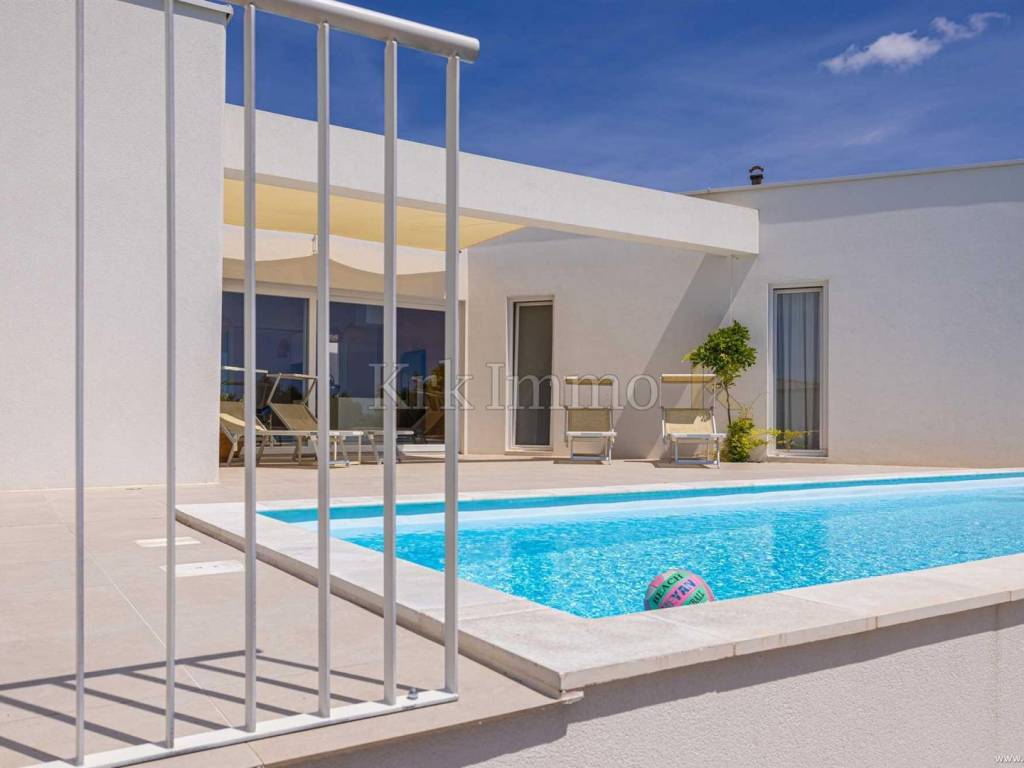 This new ground floor house of modern design consists of a hallway, three bedrooms, all of which have their own bathroom, storage, toilet and large space that brings together a kitchen, dining room and living room that has an access to a large covered terrace with a beautiful sea view. In front of the terrace there is a large pool and a spacious sunbathing area, and there are two parking spaces in the large garden.