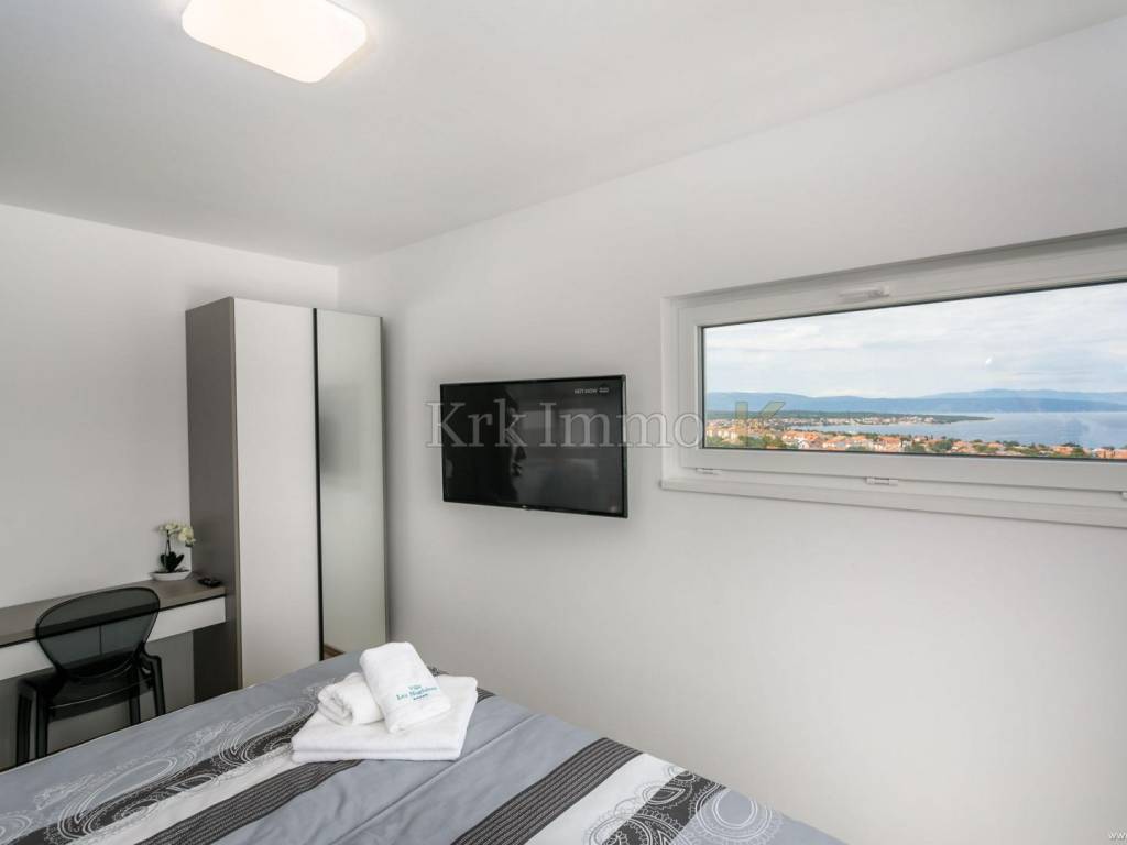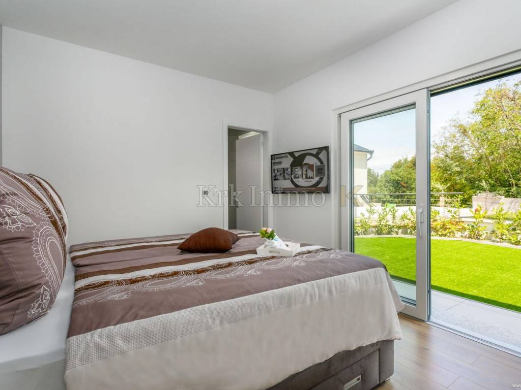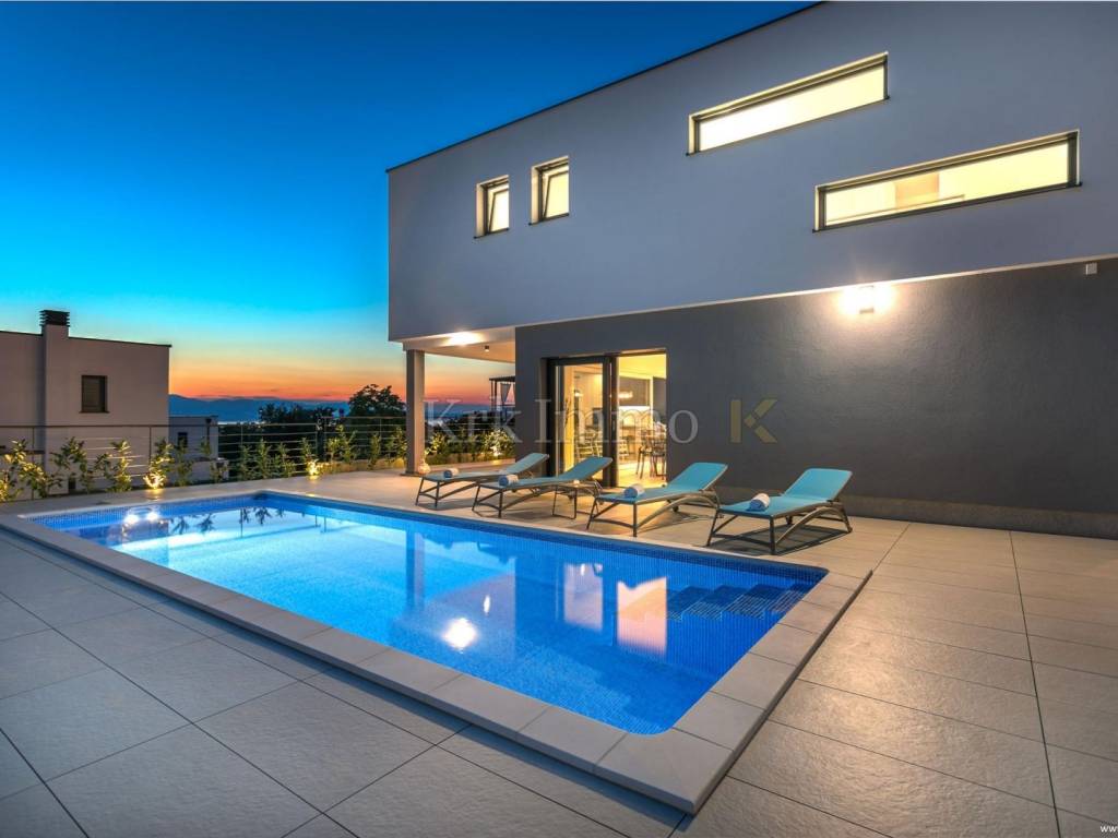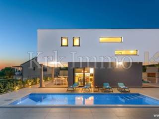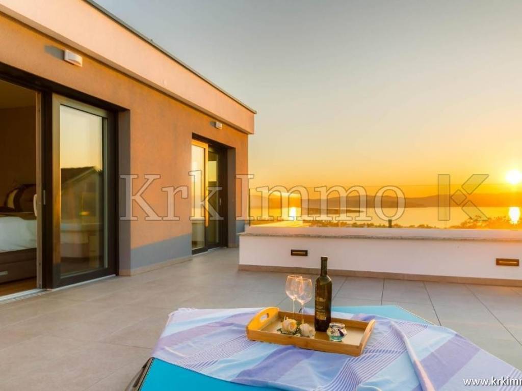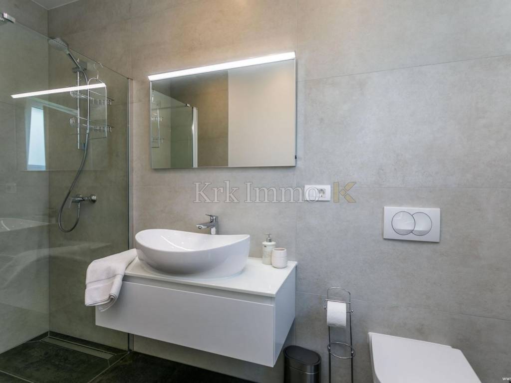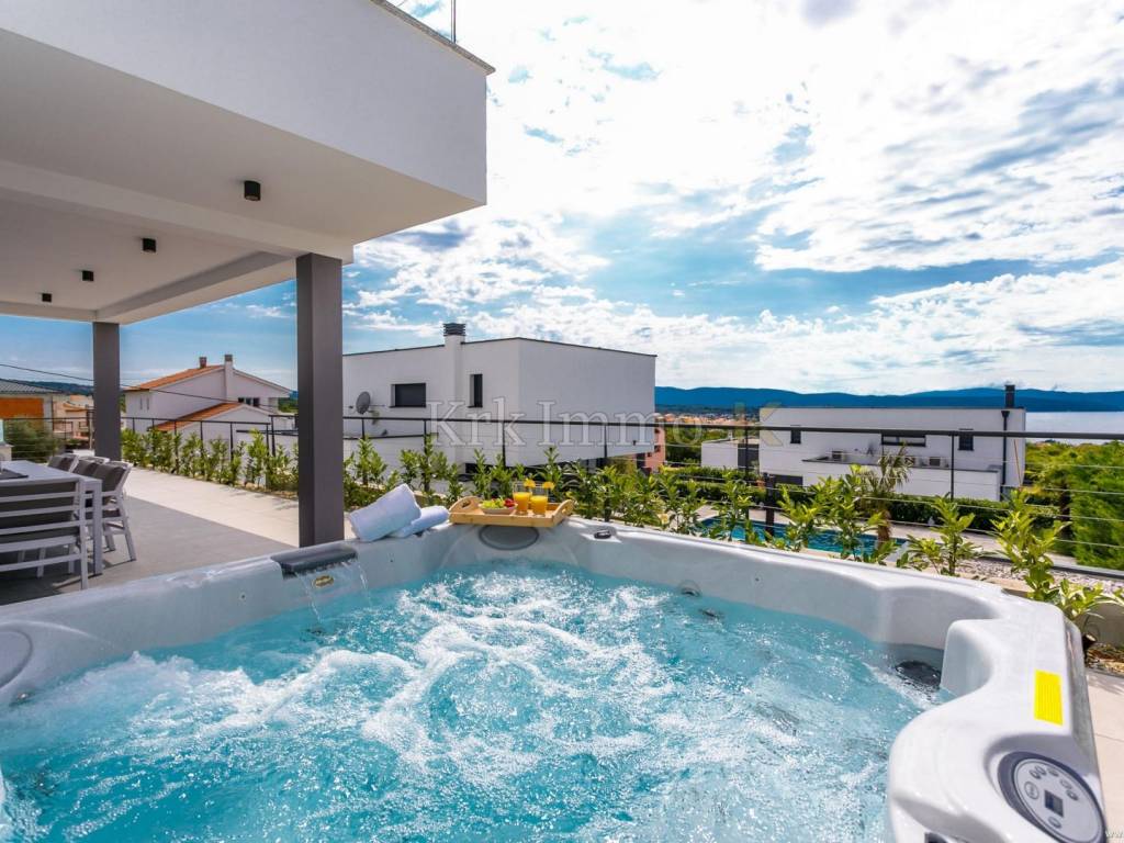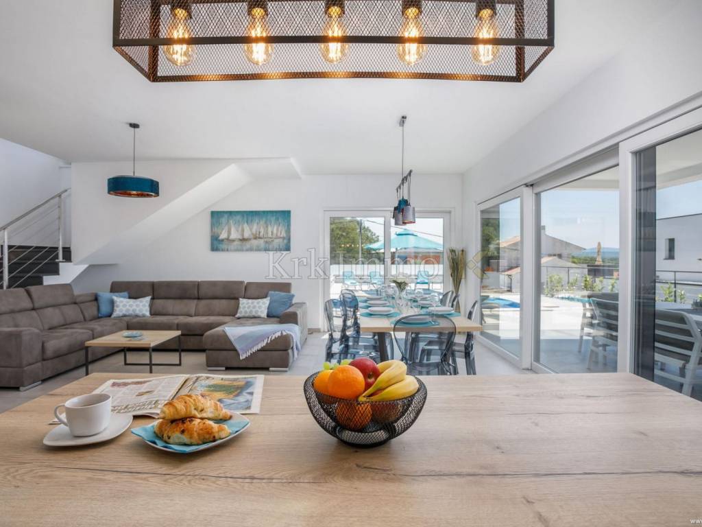 Exclusive offer! Luxury detached villa with pool, jacuzzi and sea view. From our real estate offer, we single out this beautiful detached house with a top level of equipment, which boasts a panoramic view of the sea and a beautiful location. The villa is in a quiet location in Malinska, surrounded by modern newly built villas and greenery and offers a real island idyll. The villa extends over the ground floor and first floor, and has a total living area of 180m2. On the ground floor there is a toilet, a storage room, one bedroom with its own bathroom and access to the garden, an equipped kitchen, a spacious living room and dining room with access to a covered terrace and a beautifully landscaped garden with a swimming pool and sun deck. The internal stairs lead to the first floor, where there are three bedrooms, each of which has its own bathroom and access to an uncovered balcony with a jacuzzi and a beautiful panoramic view of the sea. The 600 m2 yard is beautifully landscaped with Mediterranean plants, and has a swimming pool, sunbathing area, barbecue, outdoor shower and table tennis. Top quality construction and equipment, such as underfloor heating, a heat pump for the pool, PVC carpentry, quality sanitary ware and floor coverings, are just some of the characteristics of this beautiful villa. The property is for sale fully equipped and furnished, and it also includes two covered parking spaces. Due to its quiet location, quality equipment and beautiful panoramic view of the sea, this new building is an excellent investment opportunity. ** With KRK IMMO SERVICE AND MANAGEMENT "Click or call we do it all" - buy - rent - don't worry! You are buying a house and considering renting and want someone else to take care of it? Excellent, you are at the right place, because KRKIMMO SERVICE AND MANAGEMENT offers you a complete service after your purchase. If you decide to rent real estate, we will be happy to help and advise you so that you can reach this segment optimally without stress. We take care of everything to do with the rent and maintenance of your house, because we are the only ones who offer you a complete service when buying real estate. Brokerage commission when concluding a legal transaction for the buyer is 3% + VAT. Krk Immo d.o.o. and lawyers guarantee proper documentation and secure transfer of ownership. For all other information, contact us and make an appointment with our lawyer and advisor. Krk Immo d.o.o. Tel: +385 98 977 9705 E-mail: info@krkimmo.com www.krkimmo.com