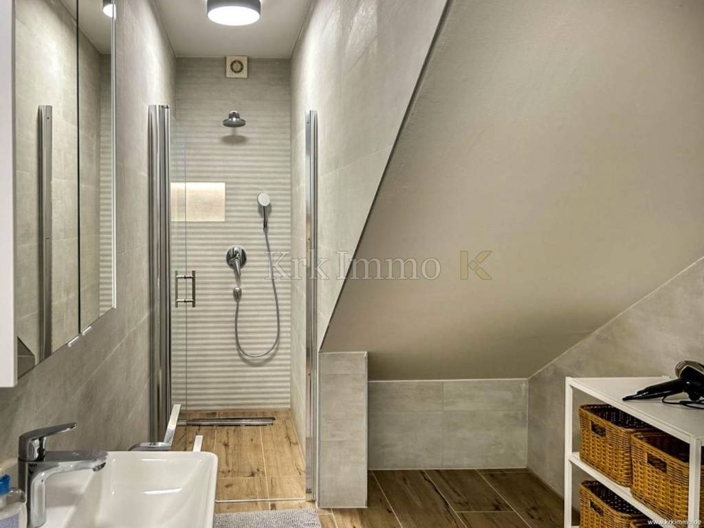 It consists of a basement and a ground floor (high ground floor) and offers a spacious and well-organized living space. In the basement there is a hallway, three cozy bedrooms, two modern bathrooms and two storage rooms with a washer-dryer.