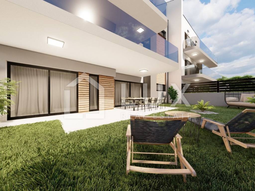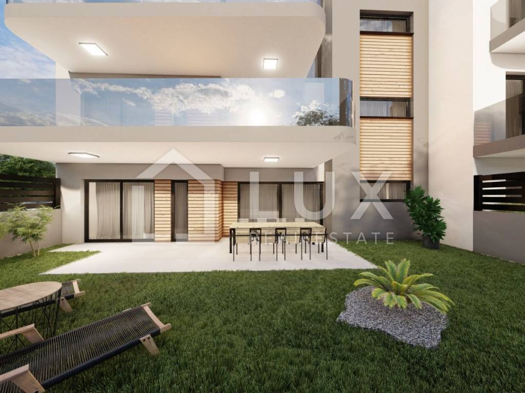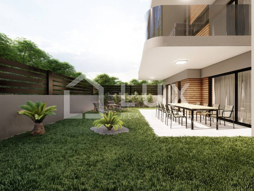 Vendiamo un appartamento al piano terra di una nuova costruzione a Rovigno. Appartamento trilocale con superficie abitabile di 90 mq, un posto auto di proprietà, cantina di 10 mq, terrazzo coperto di 26,27 mq e giardino di 64 mq. Con coefficienti di 128 m2.