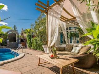 The yard is nicely decorated with a swimming pool, which is equipped with a heat pump. In the garden there is also a jacuzzi, a lounge area for enjoying the outdoor environment, as well as a sunbathing area for relaxation. The house includes air conditioning, quality ceramics and sanitary ware, and parking. It is for sale fully furnished and equipped and is ready for immediate occupancy.