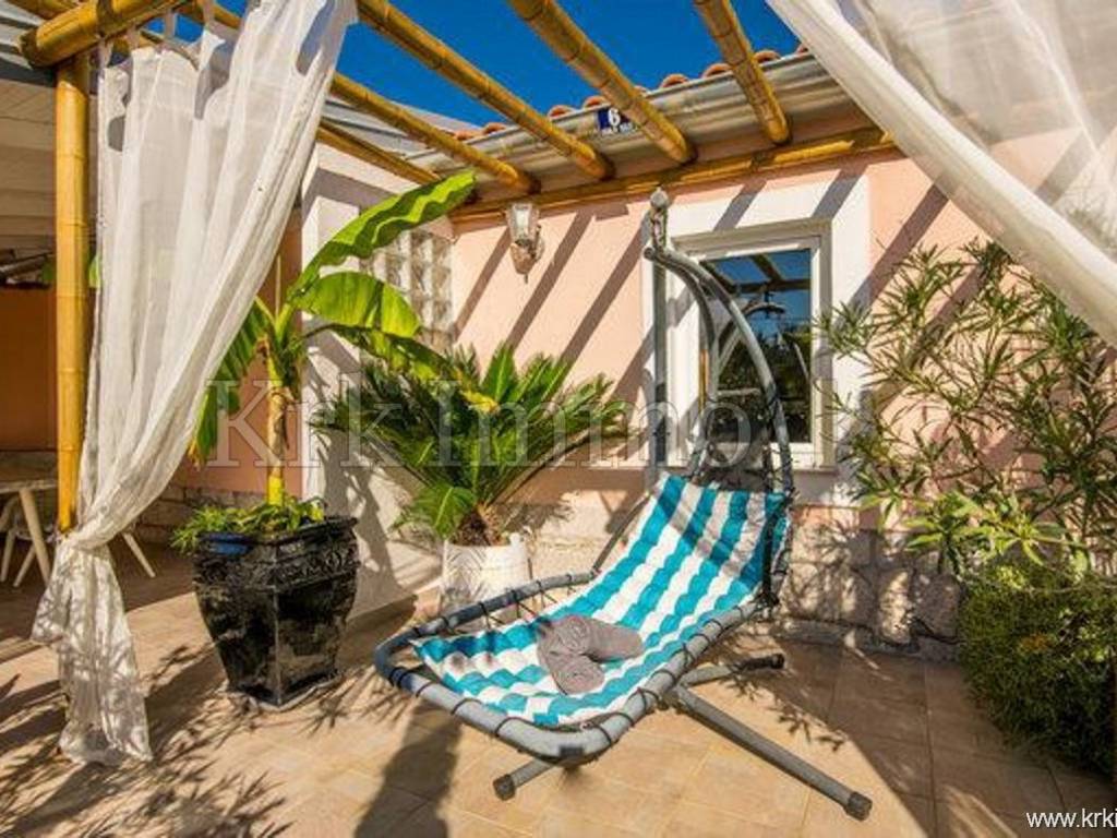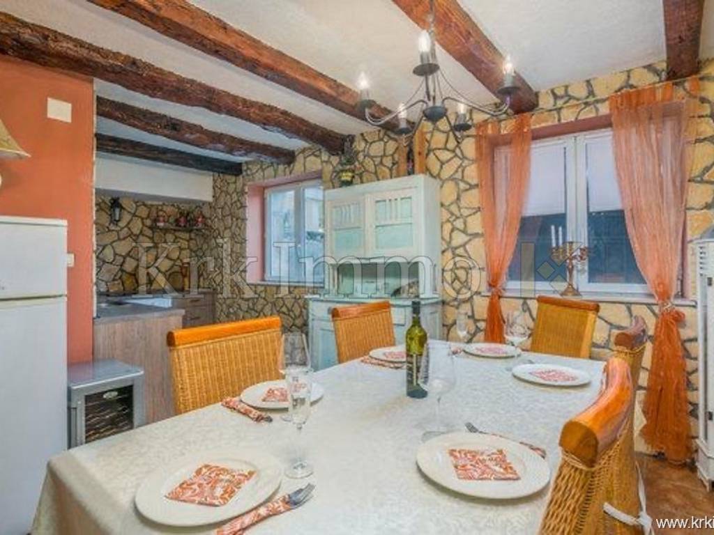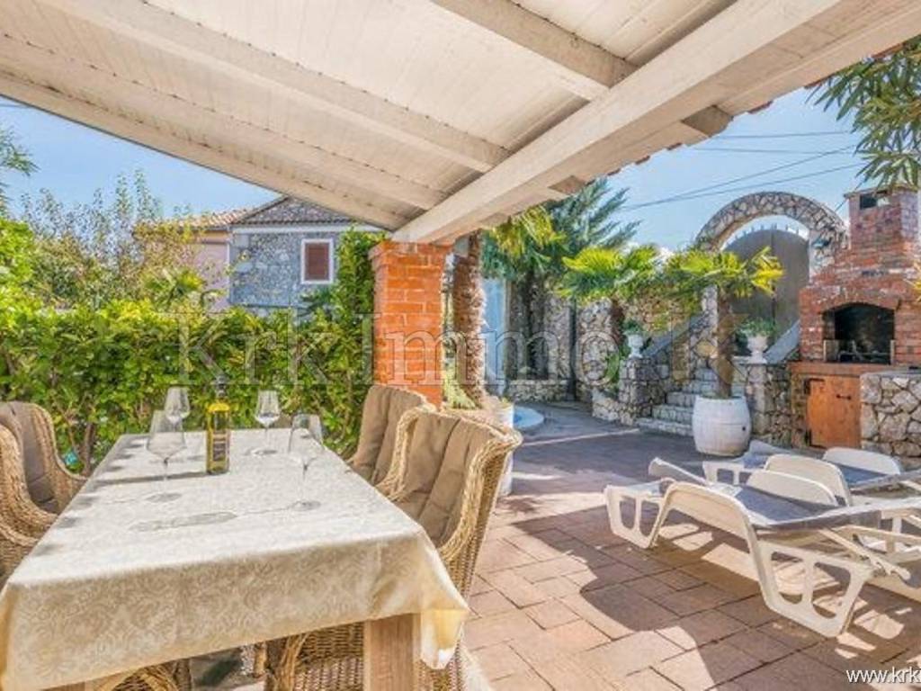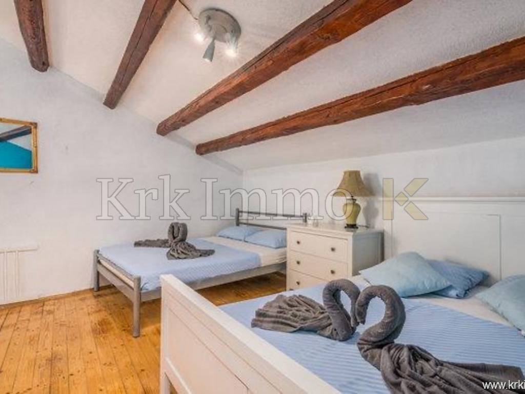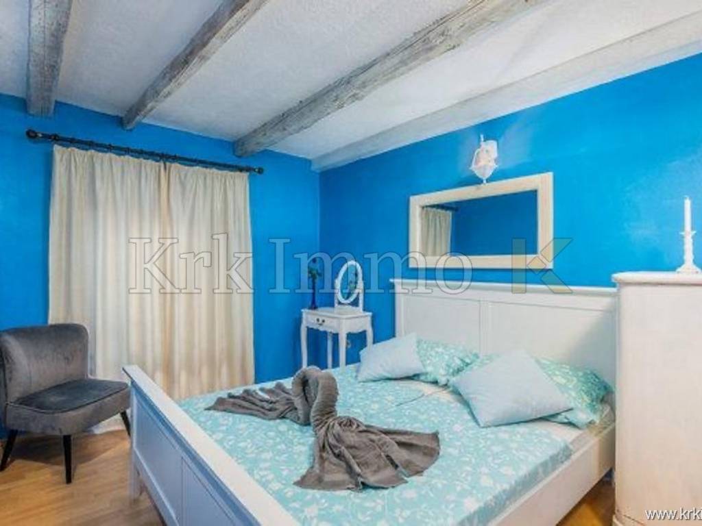 For sale is a furnished apartment house in a quiet location on the island of Krk. This house has two floors and a total area of ​​125 m2. On the ground floor is the first apartment, which consists of two bedrooms, a bathroom, a kitchen, a dining room and a living room with access to a covered terrace and a landscaped garden.