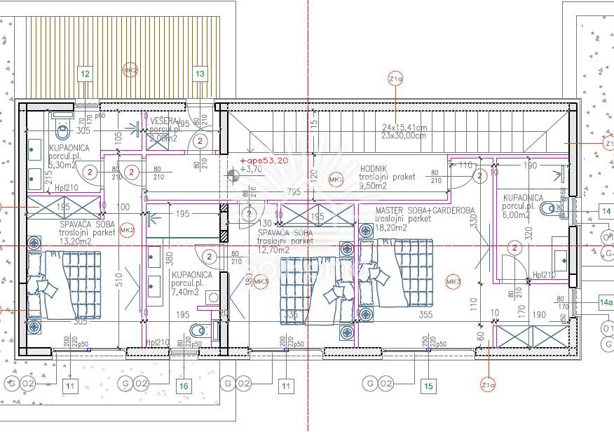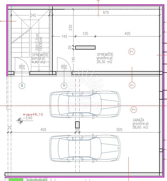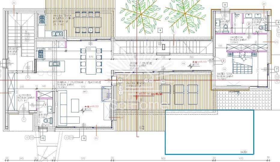 Con una superficie di 374,95 m² (netto 319,06 m²), la villa è composta da seminterrato, piano terra e primo piano. Nel seminterrato ci sono un garage per 2 auto e 2 ripostigli. Il piano terra include ingresso, WC, cucina con sala da pranzo, soggiorno, camera da letto con cabina armadio e bagno, terrazze coperte (cucina estiva e piscina di 32 m²), solarium e giardino. Al piano superiore ci sono 3 camere da letto (ciascuna con bagno), terrazza e lavanderia.