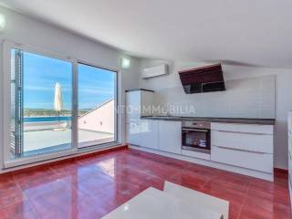In esclusiva proponiamo un confortevole appartamento in mansarda - 3° piano con terrazzo scoperto di 65 mq con magnifica vista. L'appartamento è composto da una cucina con sala da pranzo e soggiorno, una camera da letto, bagno, disimpegno e ripostiglio. Distanza dalla spiaggia solo 100 m. Costruzione di qualità. Parcheggio. Arredato modernamente, riscaldamento centralizzato, aria condizionata.