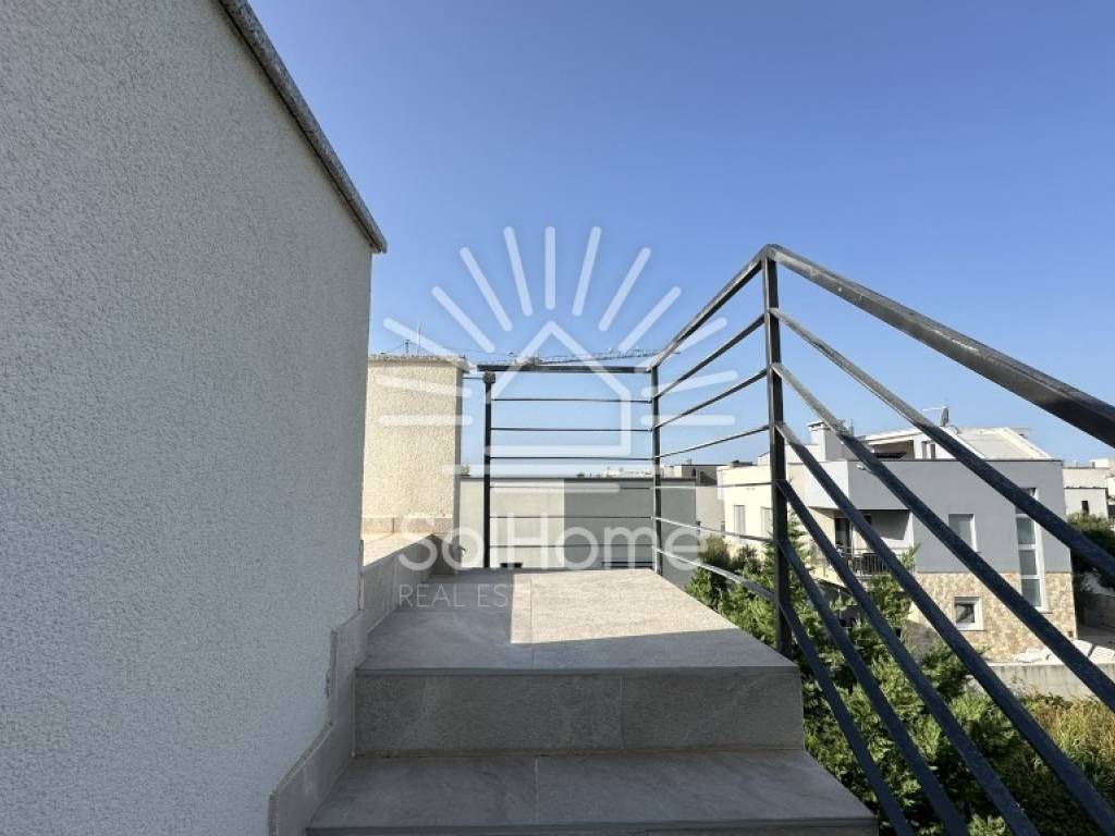 tre camere da letto, una con bagno privato e due con accesso a un’ampia terrazza Le camere da letto sono climatizzate e la casa dispone in totale di cinque climatizzatori. Il riscaldamento a pavimento è installato nei bagni, nel soggiorno, nella cucina e nella sala da pranzo. Due camere da letto e la terrazza offrono una splendida vista mare. La scala interna che collega il piano terra con il primo piano conduce anche a una terrazza sul tetto piastrellata, predisposta per cucina esterna e jacuzzi. Gli infissi sono in PVC con tapparelle e zanzariere.