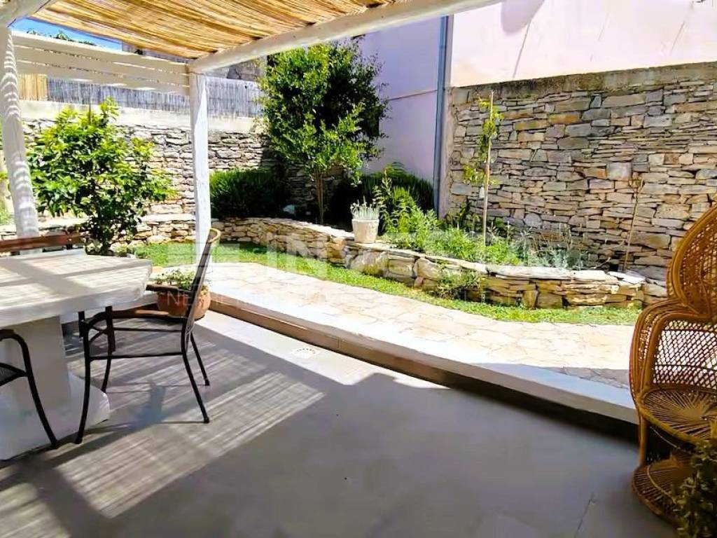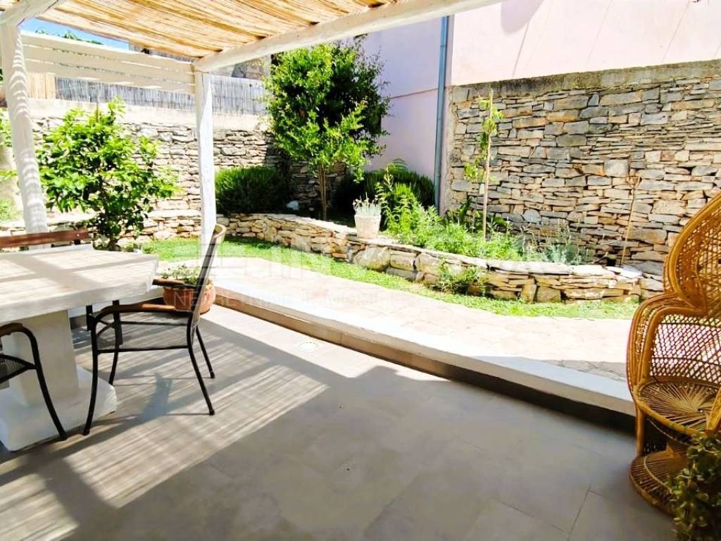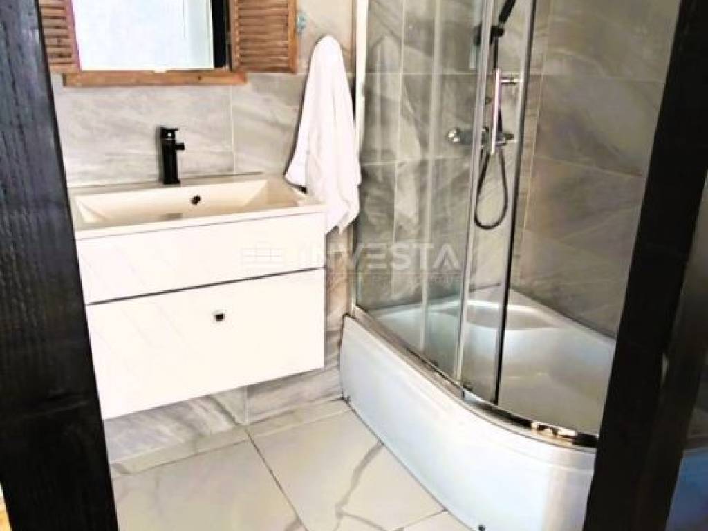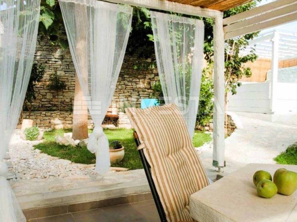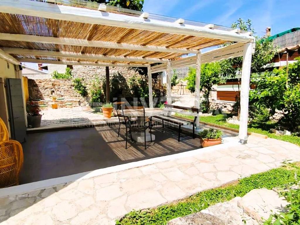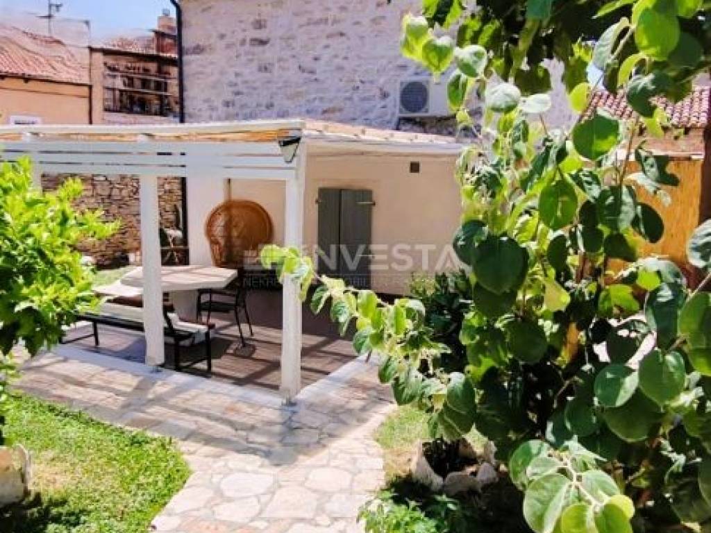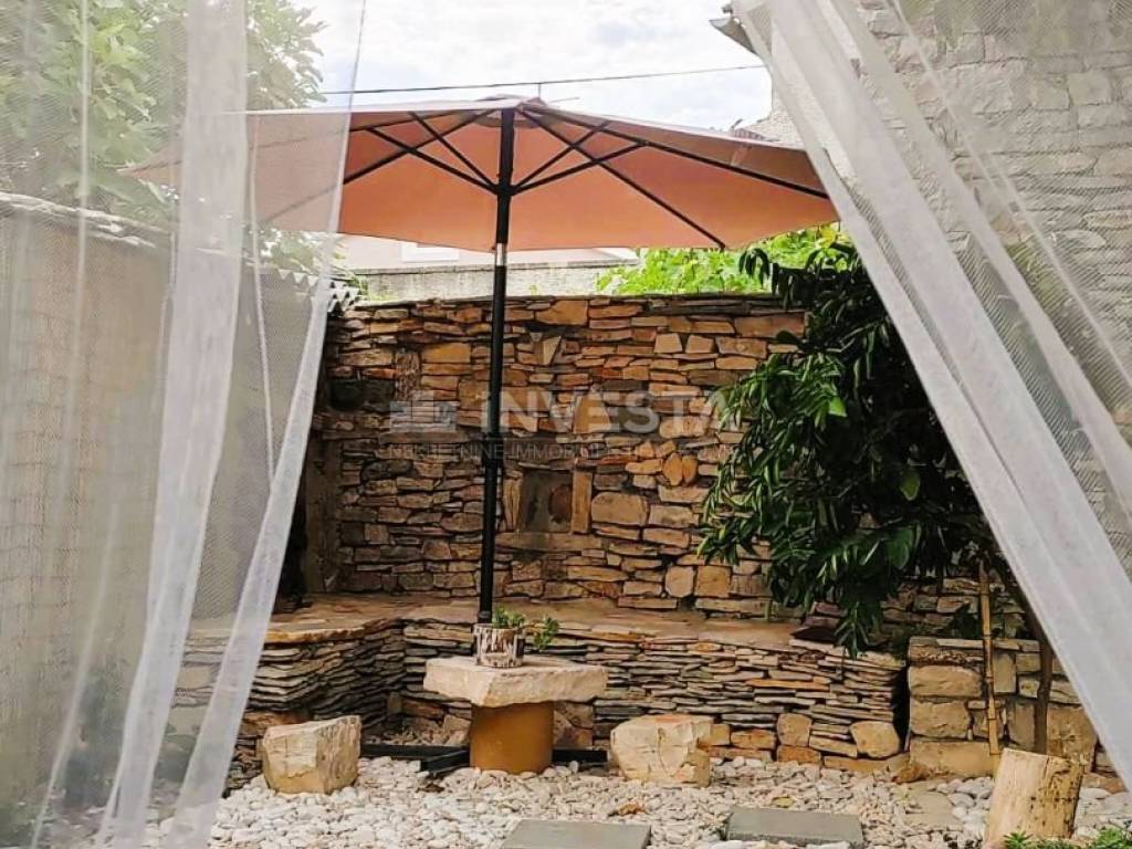Sul terreno ci sono 2 edifici con un cortile. L’edificio più piccolo necessita di ristrutturazione, offrendo così la possibilità di aumentare la superficie e aggiungere ulteriori stanze di circa 30 m2. L’edificio principale è stato ristrutturato nel 2024 e si compone di una cucina, soggiorno e bagno al piano terra, e di una camera da letto e un bagno al piano superiore. Nella soffitta c'è un altro spazio di altezza ridotta che può essere utilizzato come deposito o come stanza aggiuntiva per letti, a seconda delle necessità. Dal piano terra si accede ad una terrazza coperta di circa 25 m2 e a un ampio e bellissimo giardino curato con erbe aromatiche e alberi da frutto, un piccolo piscina prefabbricata per rinfrescarsi e una doccia solare. C'è anche una rimessa/dispensa per uso personale.