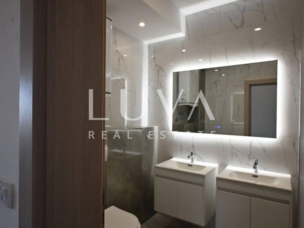 It consists of two comfortable bedrooms, a large living room ideal for relaxation and socializing, and an elegant bathroom with an LED mirror and a modern walk-in shower.
