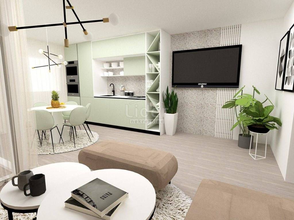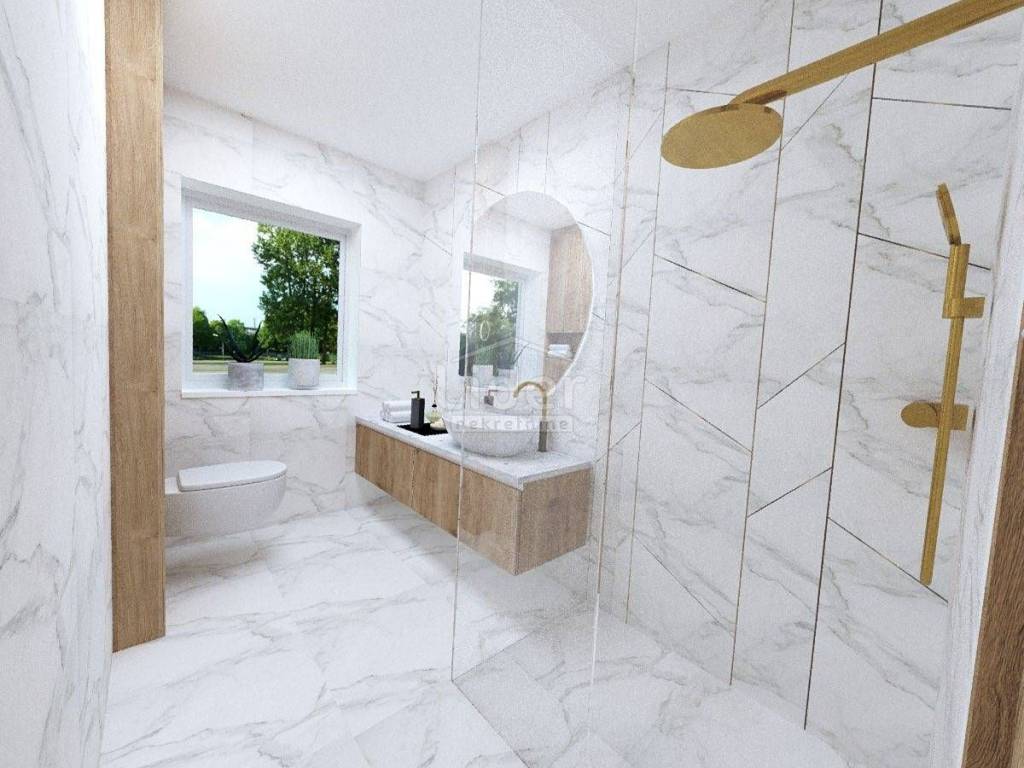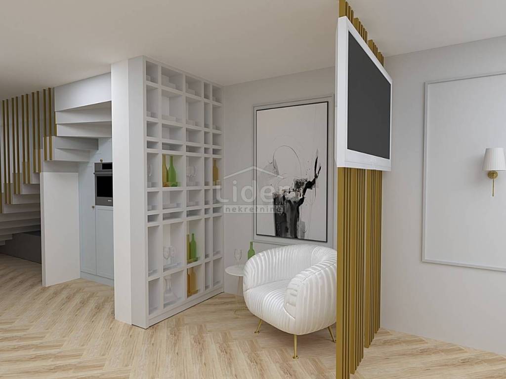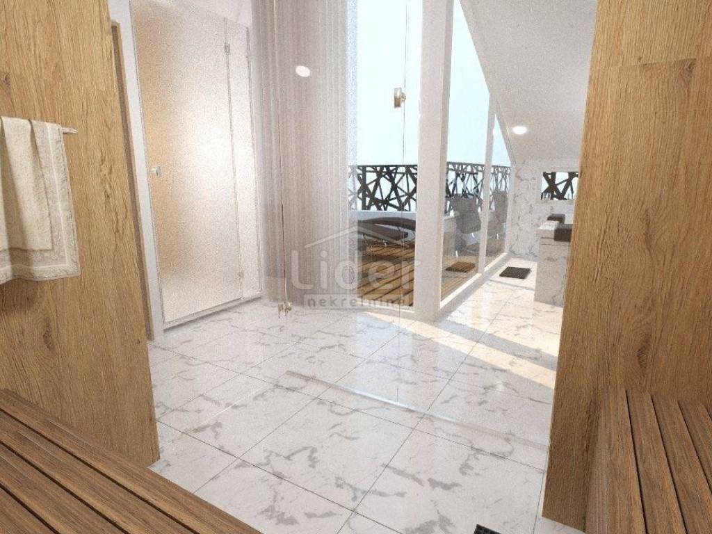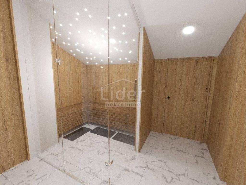 Appartamento in vendita in nuova palazzina al primo piano di una palazzina di 90mq. L'appartamento si sviluppa su due piani. Al primo piano c'è un ampio soggiorno, cucina e sala da pranzo, balcone di 8m2, due bagni, wc e due camere da letto, una delle quali ha il proprio bagno. Al secondo piano c'è una superficie di 17 m2 dove c'è una sauna e una doccia e servizi igienici + 20 m2 di terrazza dove c'è una vasca idromassaggio con una bellissima vista sul mare e sulle Alpi in lontananza. Ogni stanza dell'appartamento è dotata di aria condizionata e come riscaldamento viene utilizzato il riscaldamento a pavimento. L'appartamento dispone anche di un bel camino interno per le giornate invernali. L'appartamento dispone anche di un ripostiglio e dispone di due posti auto.