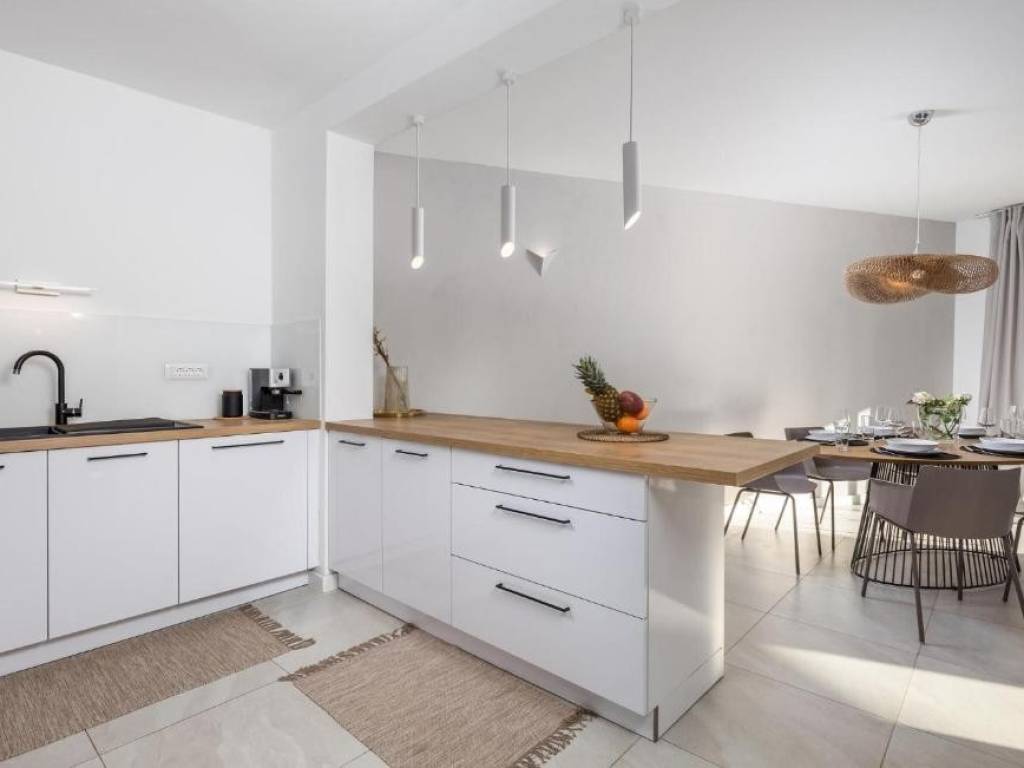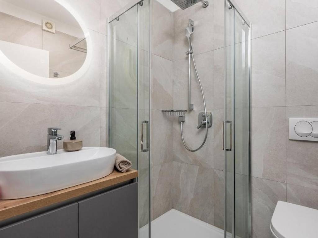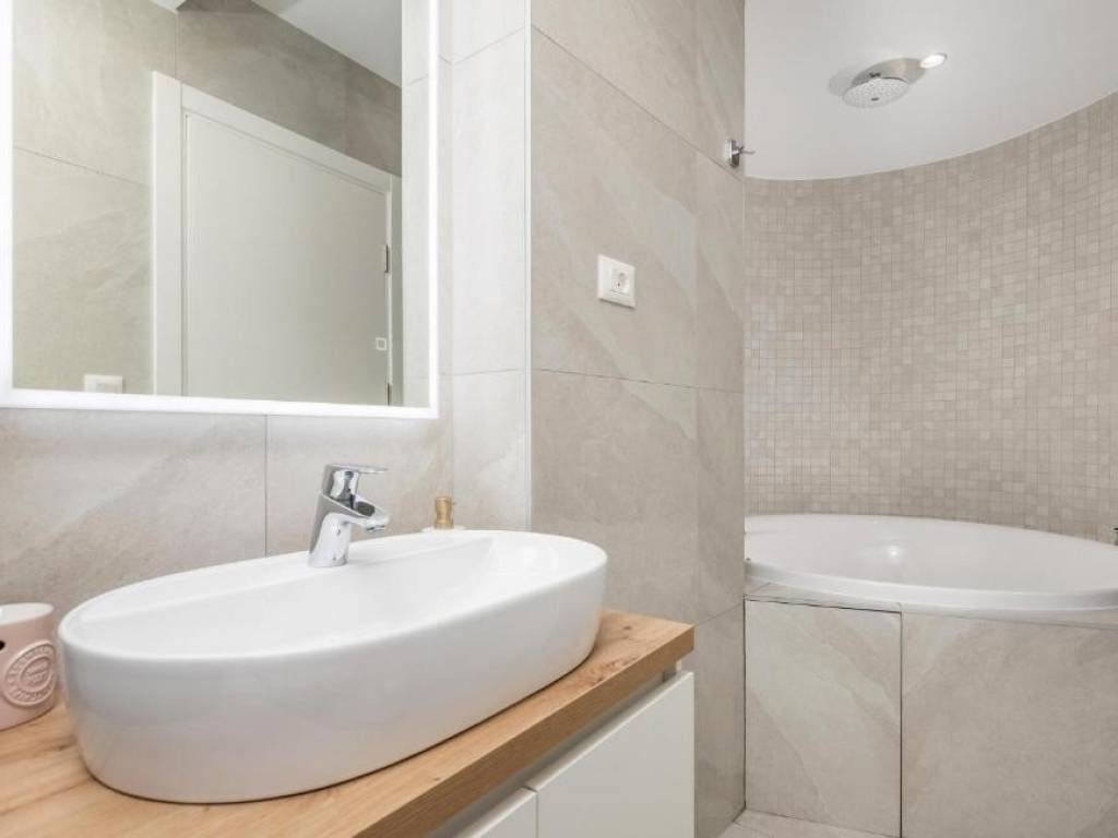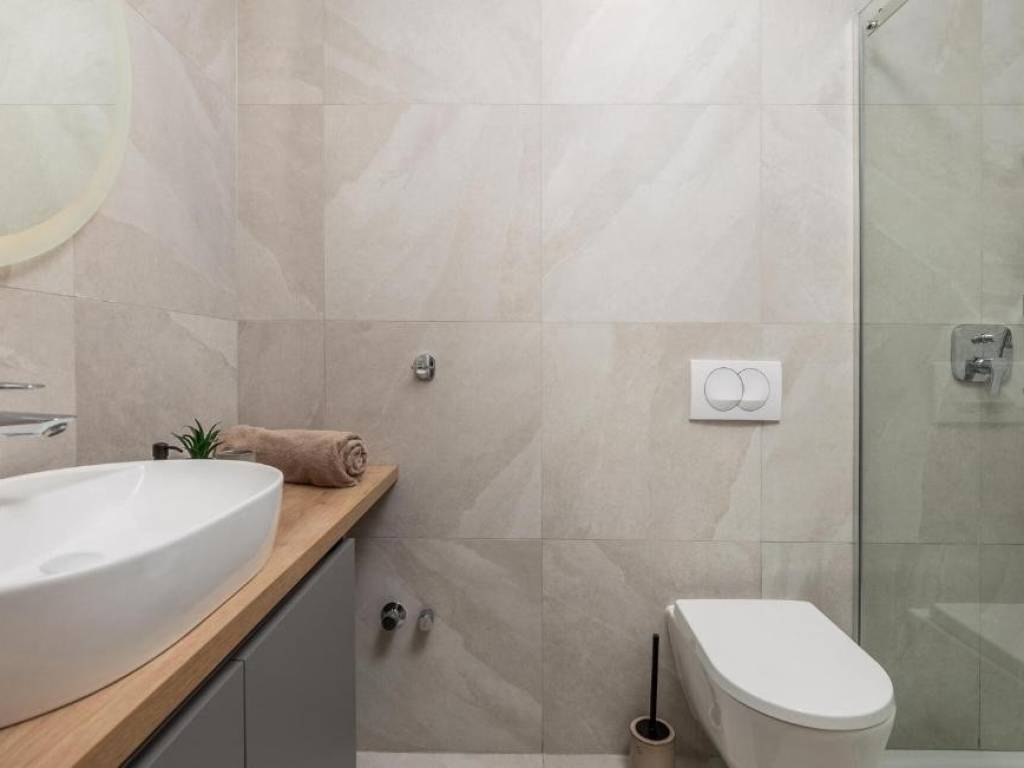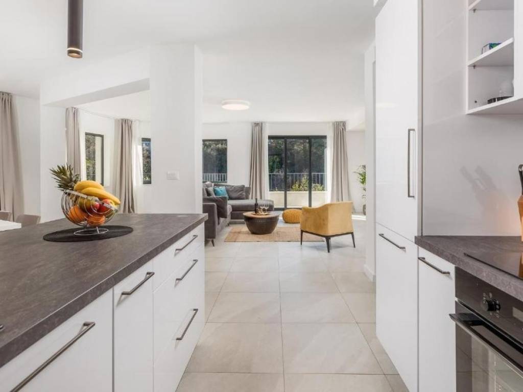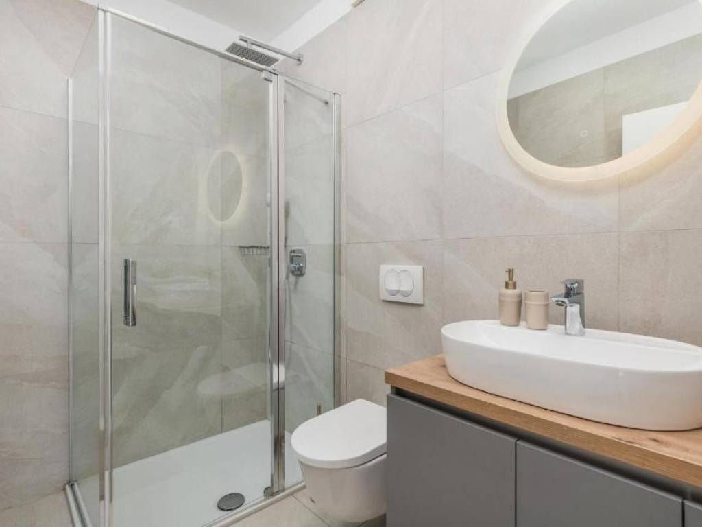 Il piano terra è concepito come un'unità di lusso separata con un altro trilocale, tre bagni dal design moderno, un WC aggiuntivo e un elegante soggiorno, cucina completamente attrezzata e sala da pranzo che continuano sulla terrazza esterna. Ogni stanza della villa è dotata di materiali di alta qualità e della tecnologia più recente, compreso il riscaldamento elettrico a pavimento che garantisce un'atmosfera piacevole durante tutto l'anno.