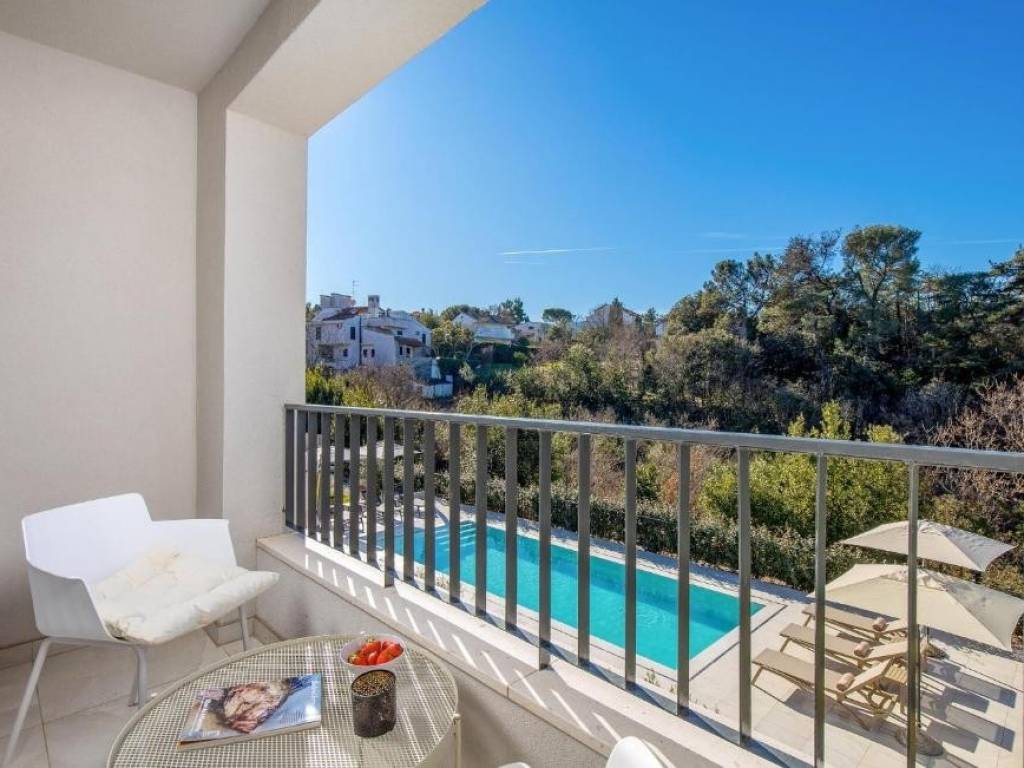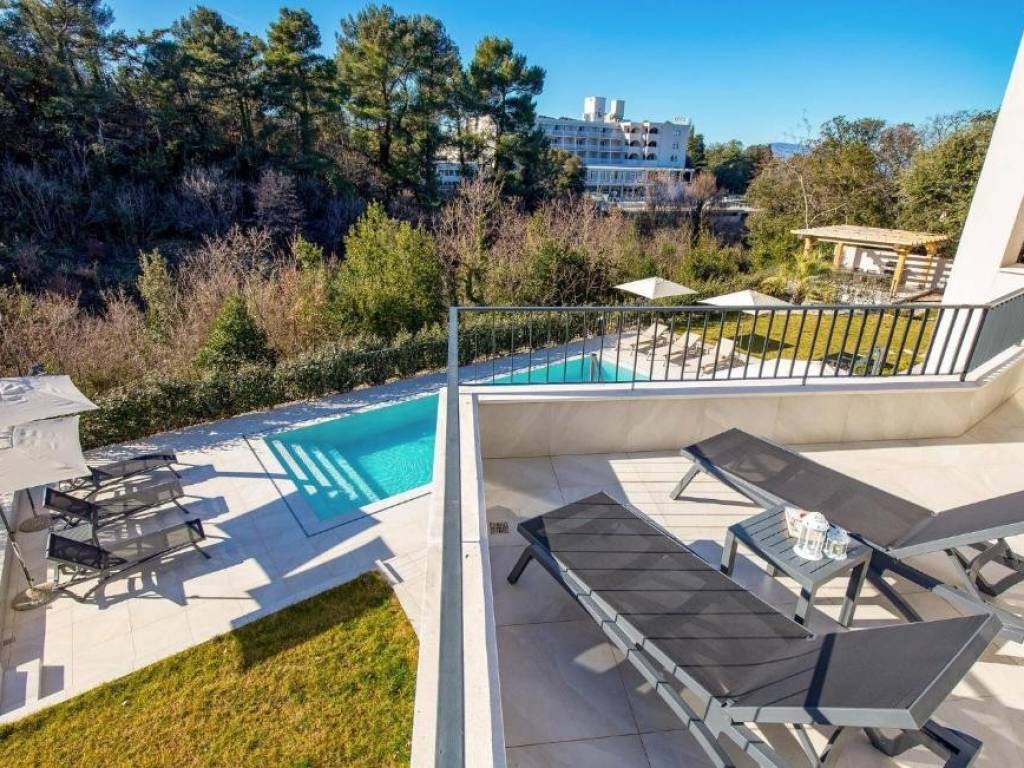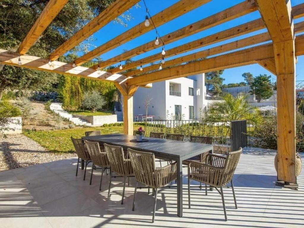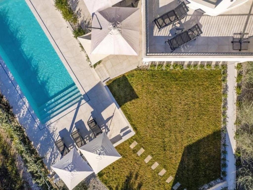 La parte centrale dell'esterno è una bellissima piscina riscaldata circondata da un'area prendisole e da un giardino mediterraneo che garantisce privacy e un ambiente rilassante. La cucina estiva situata accanto alla piscina è il luogo ideale per ritrovi e piaceri gastronomici, e sotto di essa si trova un oggetto attualmente utilizzato come ripostiglio, ma che può essere trasformato in monolocale per il personale con cucina e bagno.