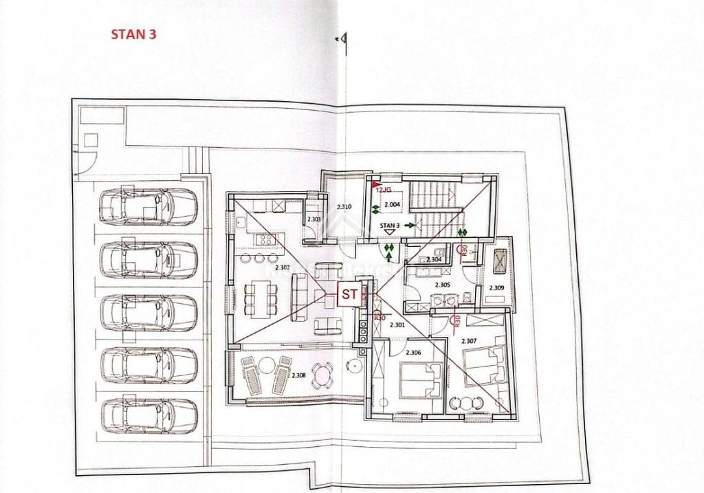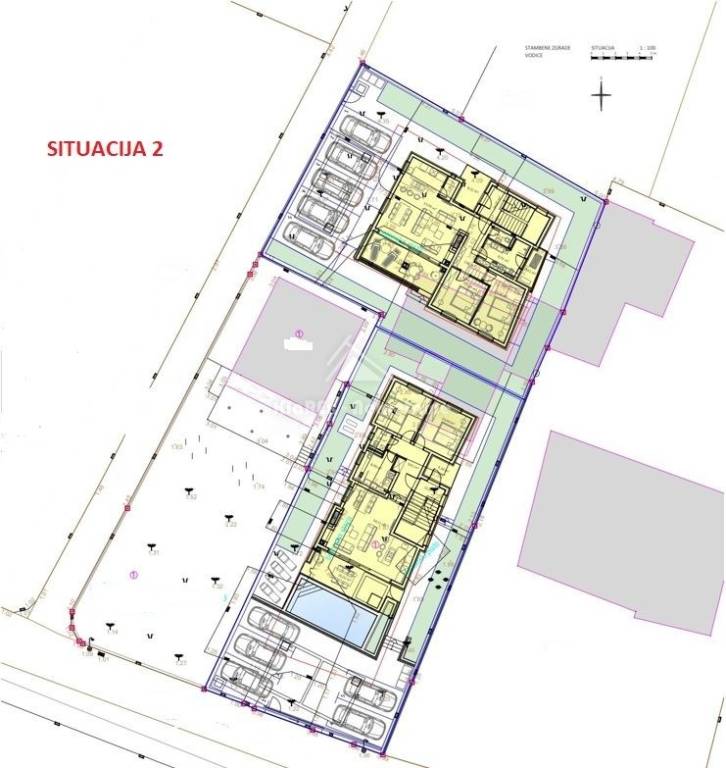 Apartment 3 - apartment on the second floor of a residential building with a net area of 109.59 m/2 including two parking spaces. The apartment consists of an entrance hall, kitchen with pantry, dining room, spacious living room with an area of 37.75 m/2 with access to a covered loggia with an area of 15.40 m/2, two bedrooms, bathroom, separate toilet and two more covered loggias. Please note that in the process of dividing the completed building there is a possibility of deviation from the stated square footage.