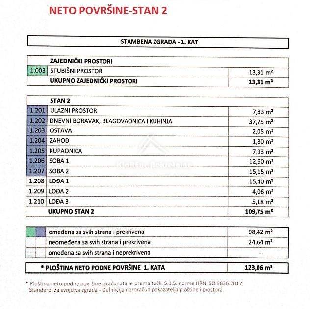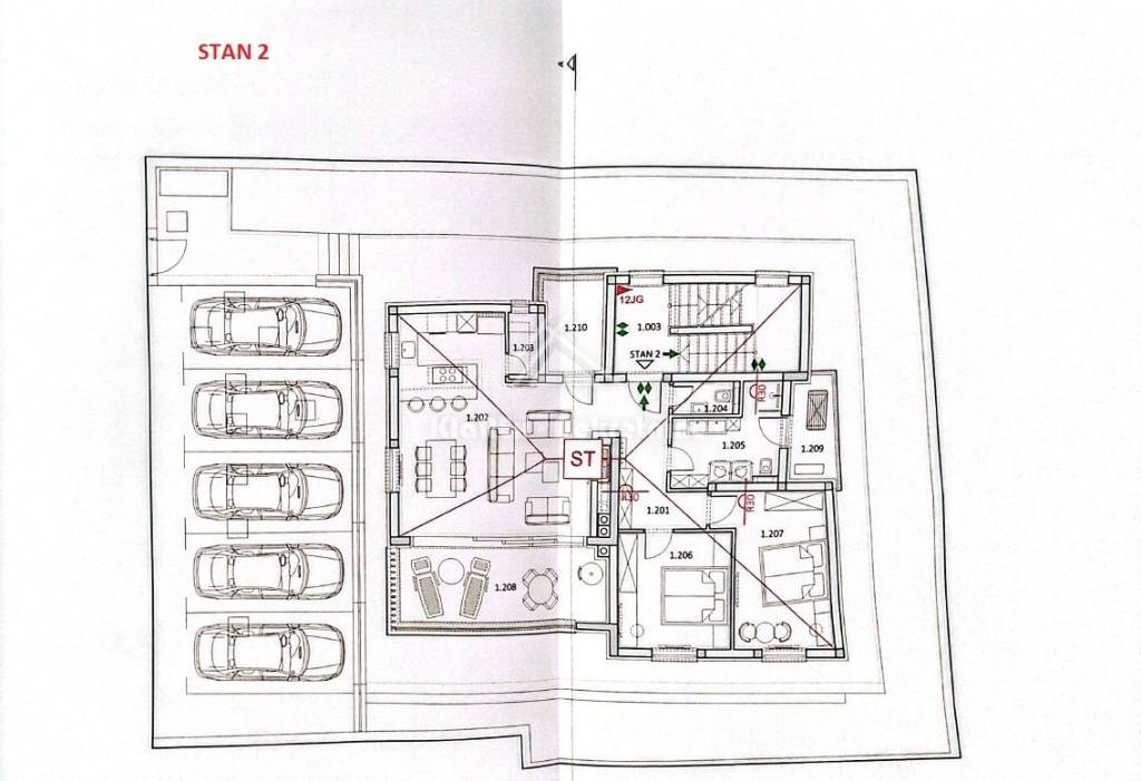 Apartment 2 - apartment on the first floor of a residential building with a net area of ​​109.59 m/2 including two parking spaces. The apartment consists of an entrance hall, kitchen with pantry, dining room, spacious living room with an area of ​​37.75 m/2 with access to a covered loggia with an area of ​​15.40 m/2, two bedrooms, bathroom, separate toilet and two more covered loggias. Please note that in the process of dividing the completed building there is a possibility of deviation from the stated square footage.