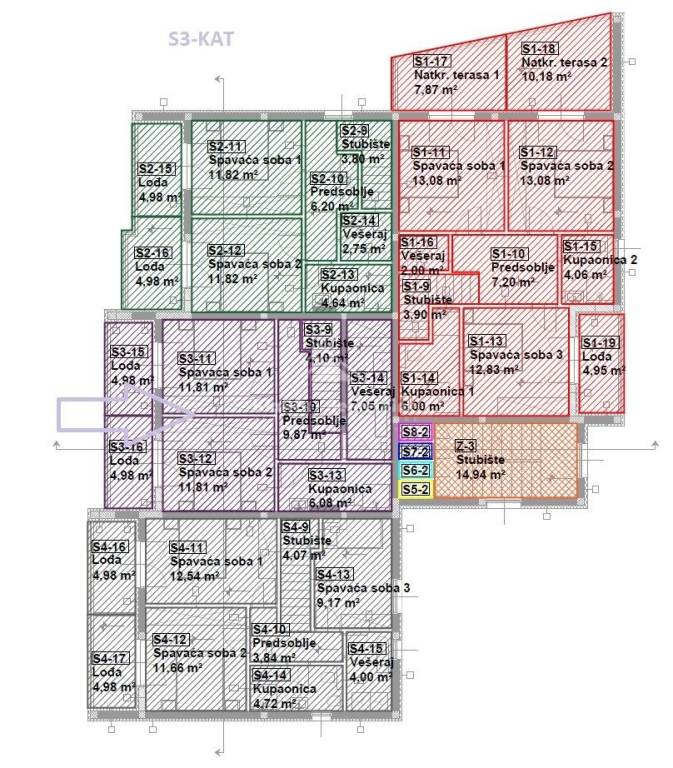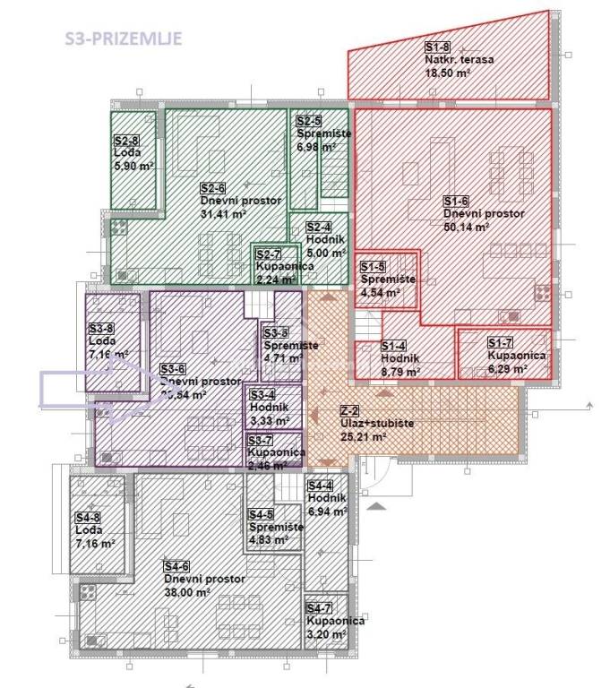 S3-bedroom, two-storey apartment on the ground floor and first floor of a residential building with a net area of ​​112.61 m/2. The apartment consists of a ground floor with an entrance hall, a living room with an adjoining kitchen and dining room, a bathroom and a small storage room. The living room opens onto a loggia with an area of ​​7.16 m/2. Internal stairs lead to the first floor where there are two bedrooms, a bathroom and a laundry room. Each room also has its own loggia. The apartment also has a garden on the ground floor with an area of ​​60.48 m/2 and two parking spaces.