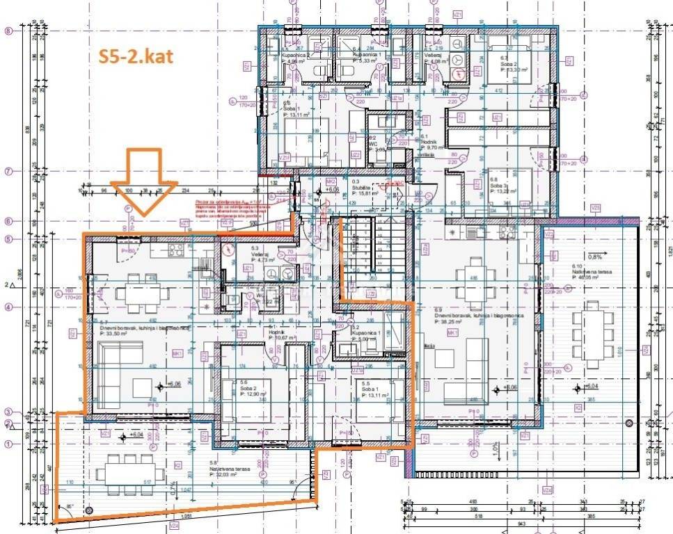 Apartment S5 - two-bedroom apartment on the second floor of a residential building with a net area of ​​103 m/2. The apartment consists of an entrance hall, two bedrooms, bathroom, laundry room, toilet and a large living room with access to a covered terrace with an area of ​​32.03 m/2. The apartment has two parking spaces.