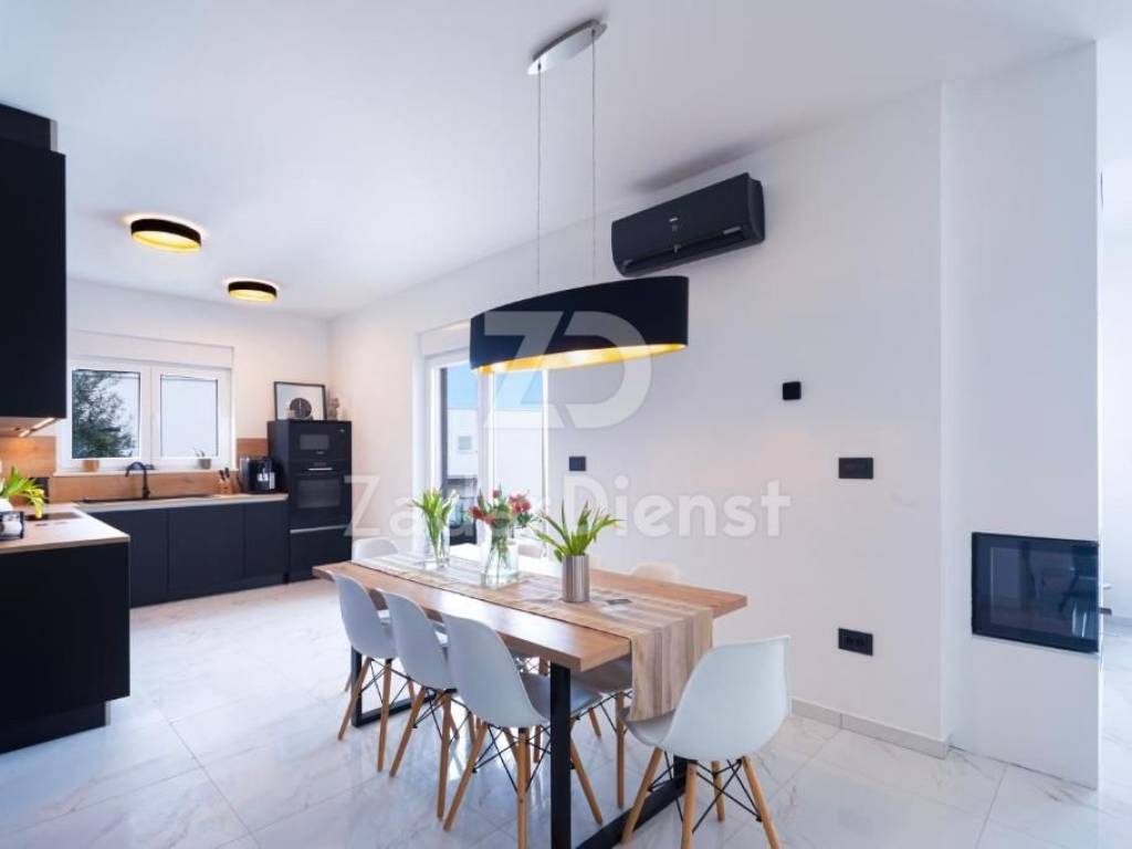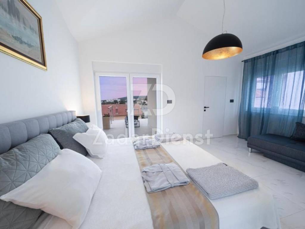 Il primo piano della villa è composto da un corridoio con scala e due camere da letto matrimoniali, ciascuna con bagno privato. Queste camere si aprono su un'ampia terrazza con vasca idromassaggio, che offre una splendida vista sul mare e sulle isole di Cherso e Lussino. La superficie totale della casa con terrazze è di 190 metri quadrati, il che consente un soggiorno confortevole per 8 persone.