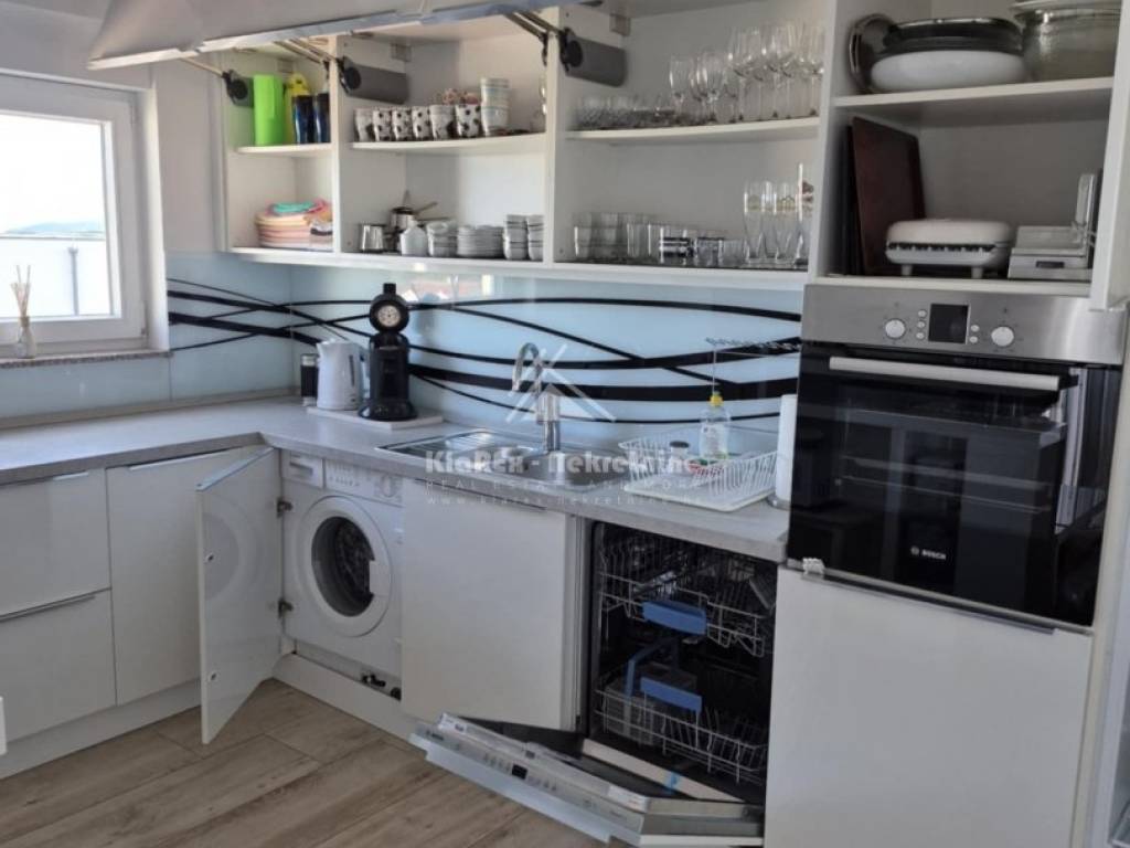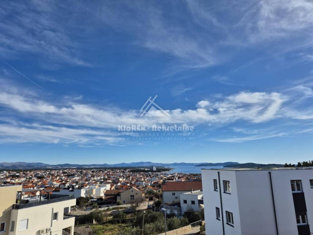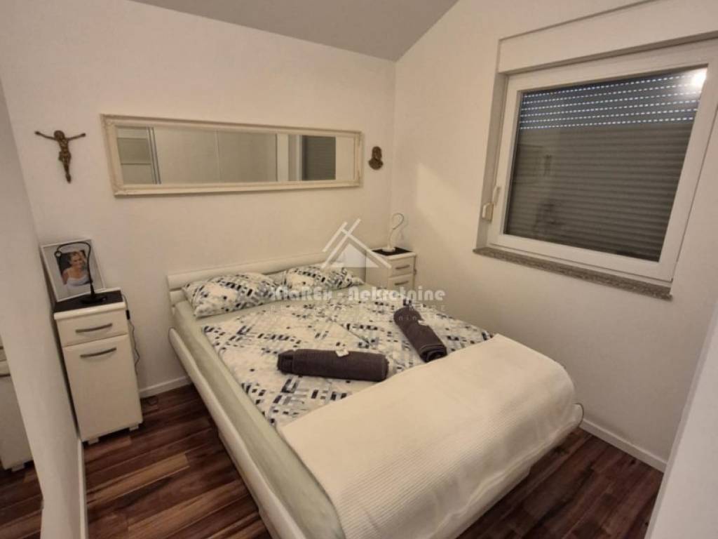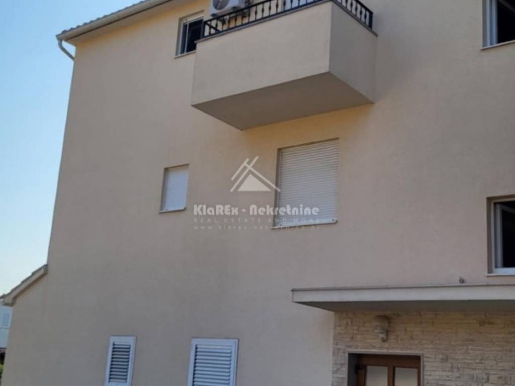 A beautiful two-bedroom apartment with a net area of 73.71 m/2 is for sale in Vodice. The apartment is located on the second floor of a small residential building, and the terrace offers a beautiful view of the sea and the city itself. The building is about 1200 meters from the city center, and about the same distance from the first equipped beach. The apartment consists of a small hallway, a living room with an adjoining kitchen and dining room, two bedrooms and a bathroom. The living room opens onto a spacious terrace with a usable area of 10.88 m/2, and one of the bedrooms also has access to a small balcony with a northern orientation of 1.44 m/2. There is also a small storage room in the basement of the building with a surface area of 1.97 m/2, and another such prefabricated storage room is located in the courtyard of the building as part of the covered parking space. The apartment is being sold fully furnished with all equipment except for the seller's personal belongings. The apartment has separate water and electricity meters, a condominium parking space, and the advantage is the fact that it is connected to the public drainage system. Ownership is clear, documentation is completely in order.