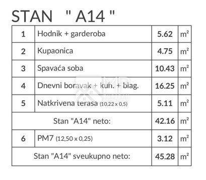 For sale is an apartment labeled "A14" located on the 2nd floor of a building with a total area of ​​45.28m2.