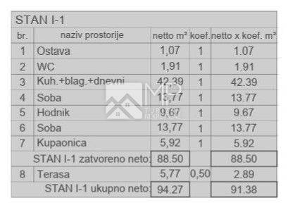 The apartment in question, marked "I-1", is located on the first floor of the building (91.38 m2), and consists of a hallway, kitchen with dining room and living room, two bedrooms, bathroom, toilet and terrace.