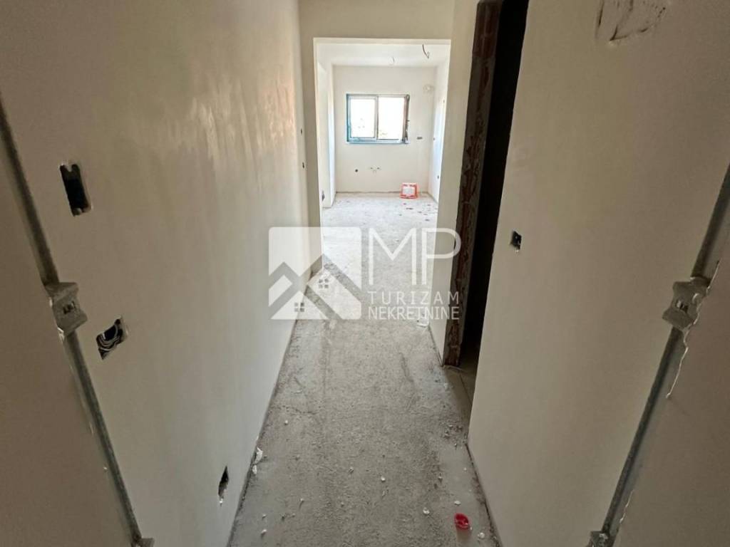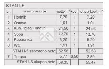 The apartment in question, marked "I-5", is located on the first floor of the building (55.47 m2), and consists of a hallway, kitchen with dining room and living room, bedroom, bathroom, toilet and terrace.