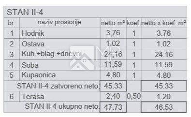 The apartment in question, marked "II-4", is located on the second floor of the building (46.53 m2), and consists of a hallway, kitchen with dining room and living room, bedroom, bathroom, and terrace.